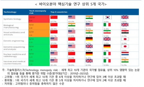 바이오 분야 핵심 기술 연구 상위 5개 국가 분석