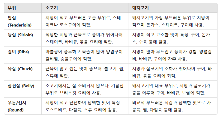 소고기와 돼지고기는 각기 다른 매력과 풍미를 지닌 고기로, 요리 목적에 따라 부위를 선택하여 다양한 요리를 즐길 수 있습니다. 각 부위의 특징과 조리법을 잘 이해하면, 더 맛있고 만족스러운 요리를 만들 수 있습니다.
