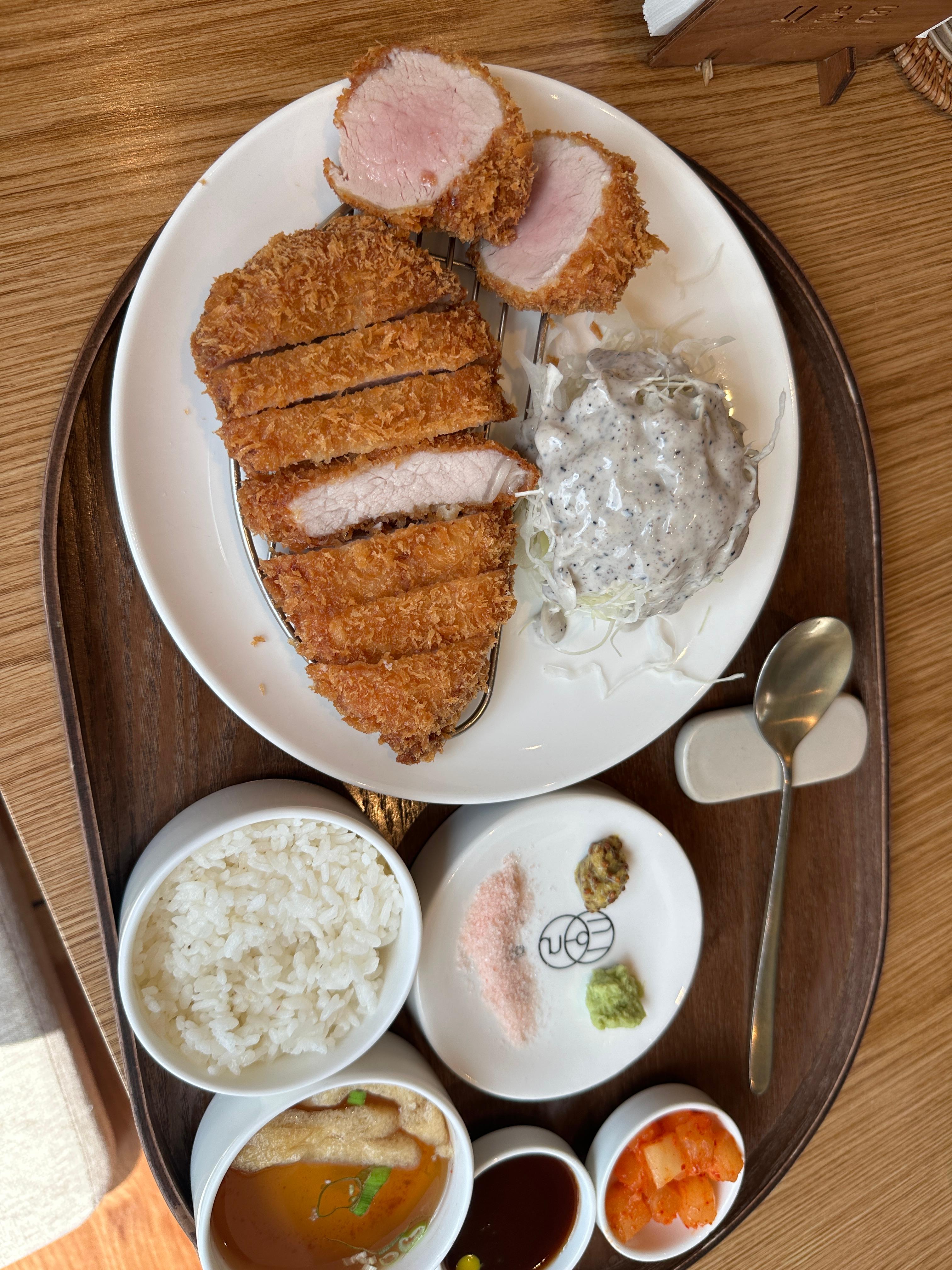 메뉴는 기본적으로 등심, 특등심, 안심 돈카츠로 구성된 정식 세트들이 주를 이루고 있었습니다. 제가 방문했을 때 가장 눈에 띈 것은 한정메뉴로 소개된 특등심카츠였어요. 직원 설명에 따르면 특등심 부위는 등심과 가브리살(등겹살), 목살이 만나는 아주 귀한 부위라서 돼지 한 마리에서 단 4인분밖에 나오지 않는다고 합니다 . 그래서 한정판매로 내는 것 같았는데, 희소성 때문인지 많은 손님들이 찾아와 주문하는 인기 메뉴라고 했어요. 그 외에도 담백한 안심카츠 정식, 표준적인 등심카츠 정식이 있고 치즈를 곁들인 메뉴도 보였으며, 돈카츠와 우동이나 카레를 곁들인 세트 구성도 준비되어 있었어요. 실제로 특등심카츠 정식을 시키면 미니 토마토 카레우동이 함께 나온다고 해서 무척 독특하게 느껴졌습니다 . 기본 세트에는 바삭하게 튀긴 돈카츠와 함께 신선한 양배추 샐러드, 따뜻한 국물(우동장국), 김치나 깍두기 등이 제공되었고, 와사비와 홀그레인 머스터드, 핑크 소금, 돈카츠 소스 등 3가지 이상의 소스/양념을 취향껏 찍어 먹을 수 있게 내어주는 점이 인상적이었어요 . 메뉴 구성에서 느껴지듯이 고기 자체의 맛을 살리기 위한 세심한 구성이라는 생각이 들었습니다.