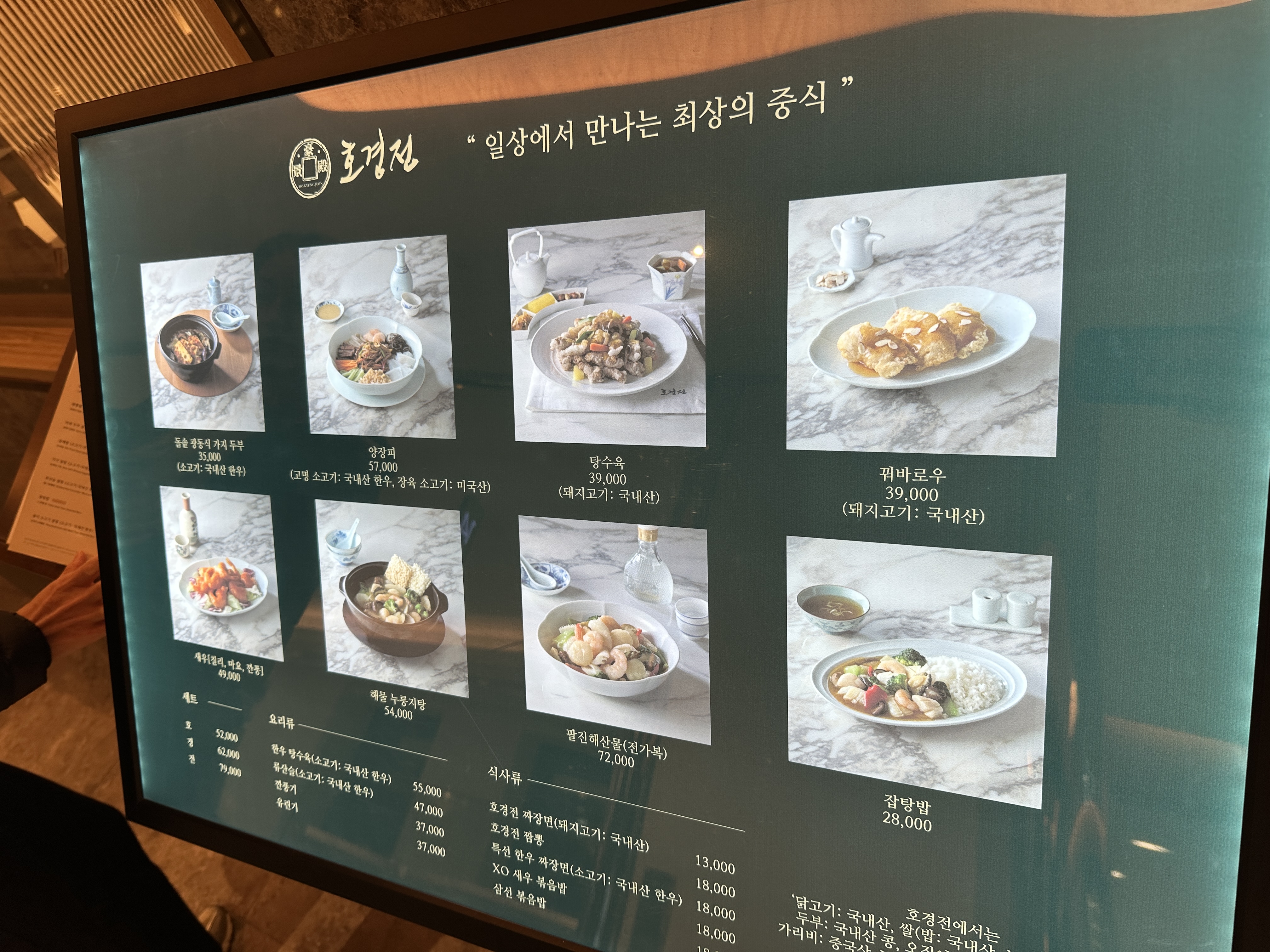 • 반면 짜장면·짬뽕은 비교적 담백한 편이라는 평이 있다. 한 방문자는 호경전 짜장면을 “정말 맛있었다”고 했으나 , 다른 이들은 일반 중식당보다 간이 덜 강해 ‘건강한 맛’으로 느껴진다고 지적하기도 했다 . 전반적으로 주요 메뉴는 고급스럽고 깔끔한 맛을 지녔다는 긍정적인 평가가 우세하다  .
