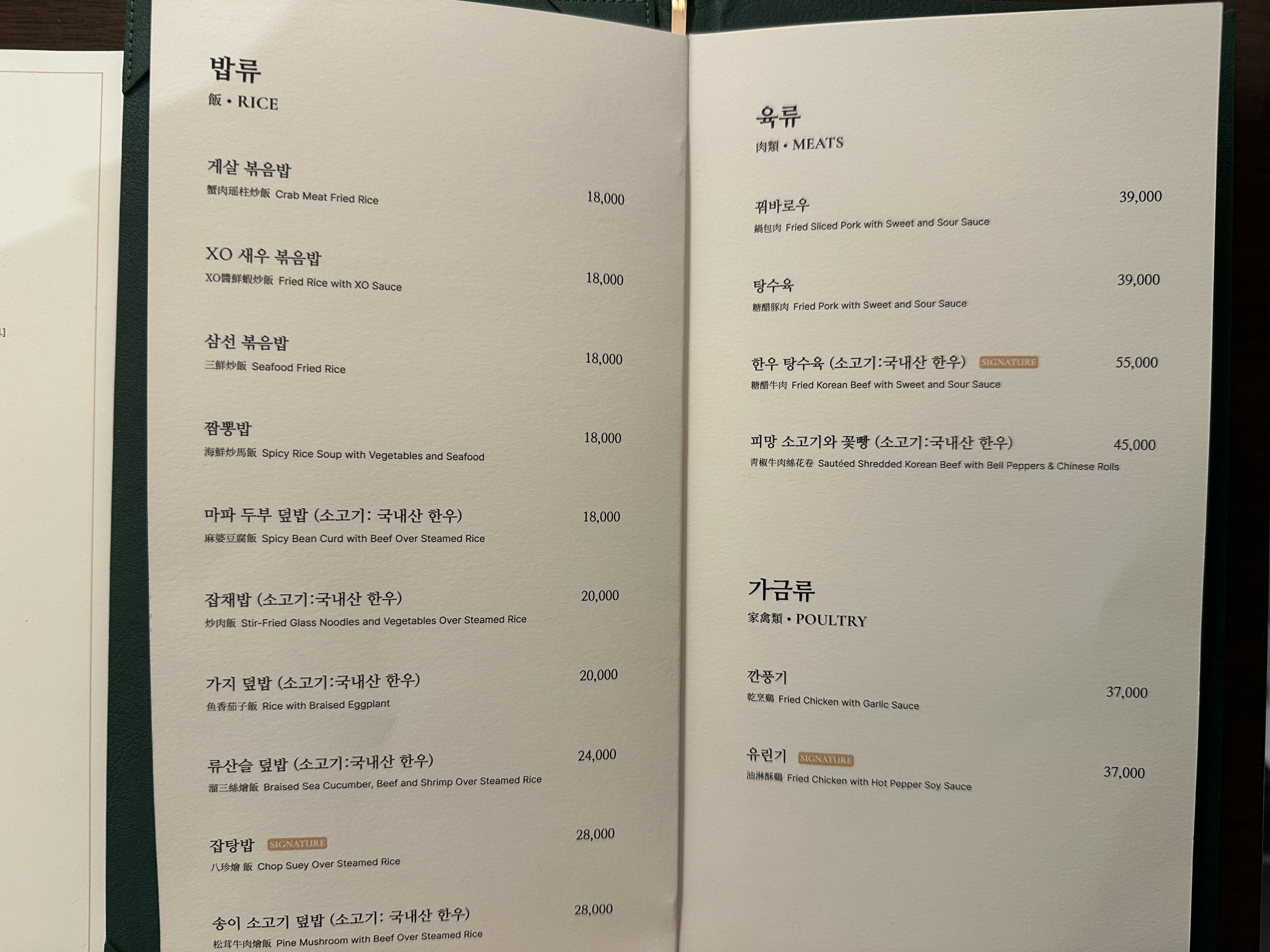• 꿔바로우(탕수육) – 달콤한 소스에 쫄깃한 식감이 살아 있어 단맛과 바삭함을 동시에 느낄 수 있다 . 기본 돼지고기 탕수육 외에 고급 한우 탕수육도 있으나 가격이 높다.