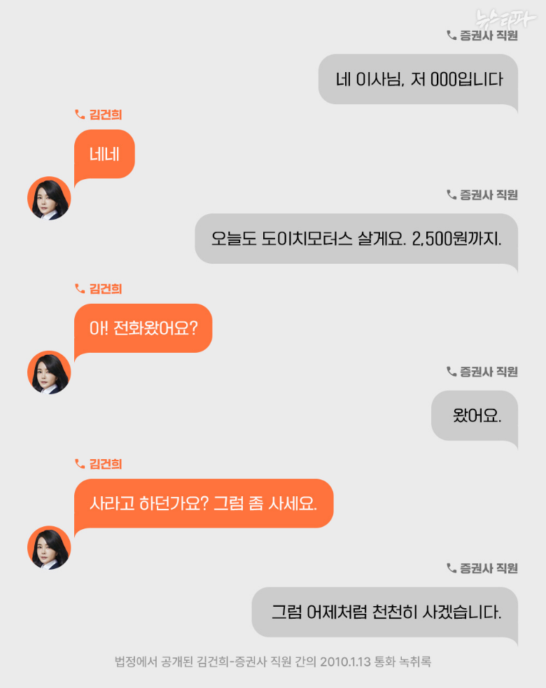 윤석열 대통령은 대선 후보 시절, 김건희 여사가 주가조작 사건과는 무관하며 단지 계좌 관리만 맡겼다고 해명했으나, 법정에서 공개된 녹취록에 따르면 김건희 여사는 도이치모터스 주식을 직접 매수했을 뿐만 아니라, 주식 거래의 최종 승인도 내렸습니다. 2010년 1월 12일과 13일, 김건희 여사는 증권사 담당자와 통화하며 도이치모터스 주식 매수를 직접 지시하고 확인하는 내용이 담긴 녹취록이 법정에서 공개되었습니다. 특히 2010년 1월 12일 김건희 여사가 도이치모터스 주식을 대량으로 매수한 사실이 밝혀졌으며, 이로 인해 윤석열 대통령의 해명과 상반되는 증거가 드러났습니다.