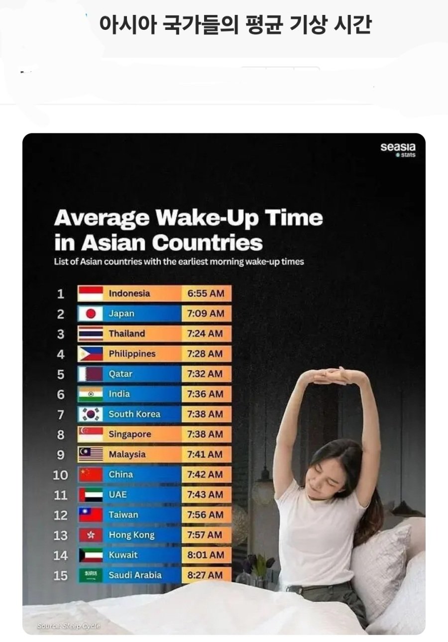 아래 글은 해당 인포그래픽(‘Average Wake-Up Time in Asian Countries’)을 중심으로, 각 국가별 평균 기상 시간과 그 배경 및 의미를 조금 더 깊이 있게 살펴보는 글입니다.