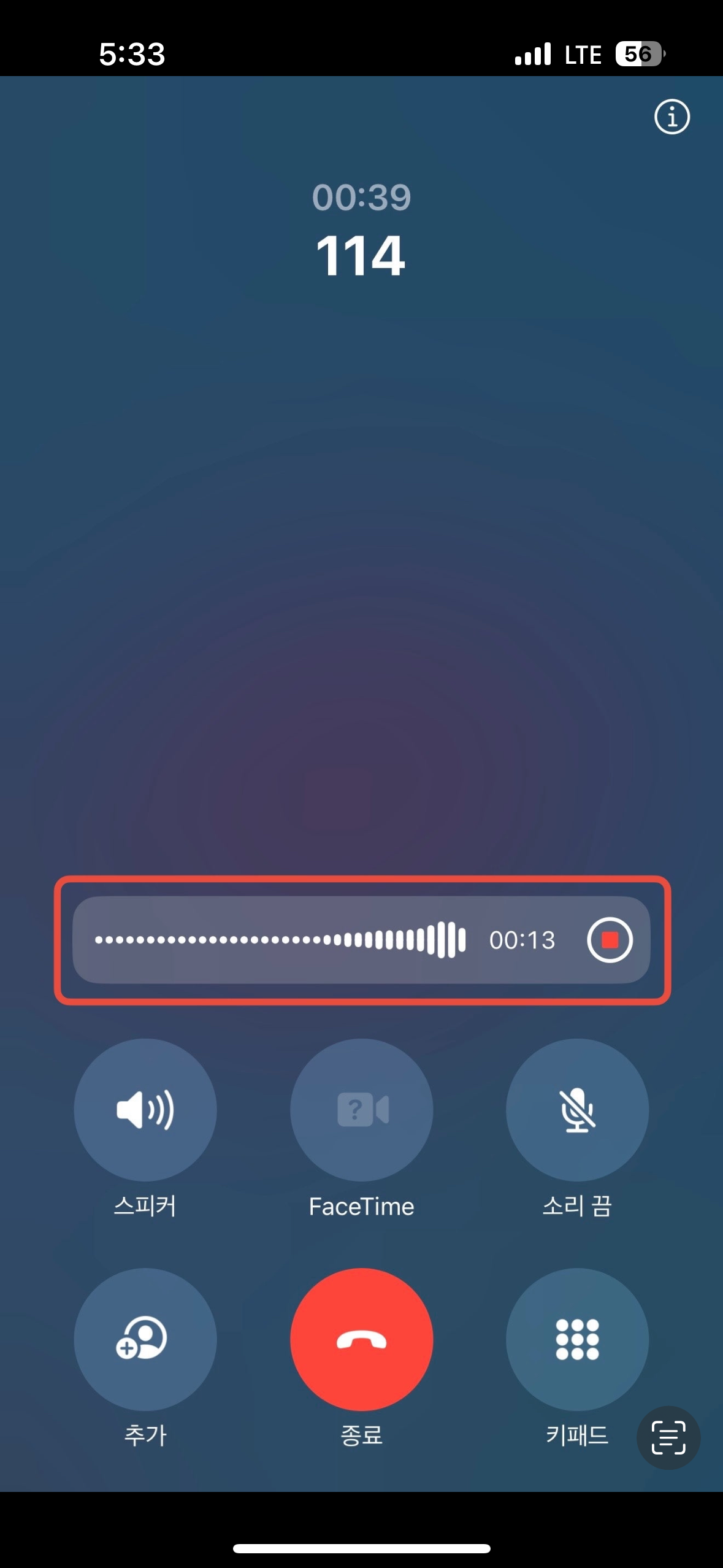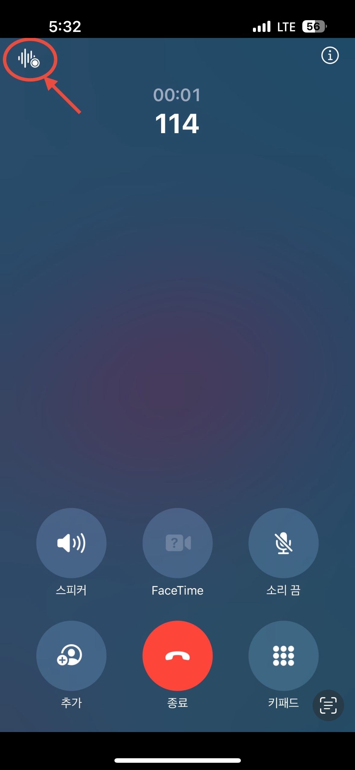 • 통화 중 화면 왼쪽 상단의 녹음 아이콘을 터치하면 녹음이 시작됩니다.