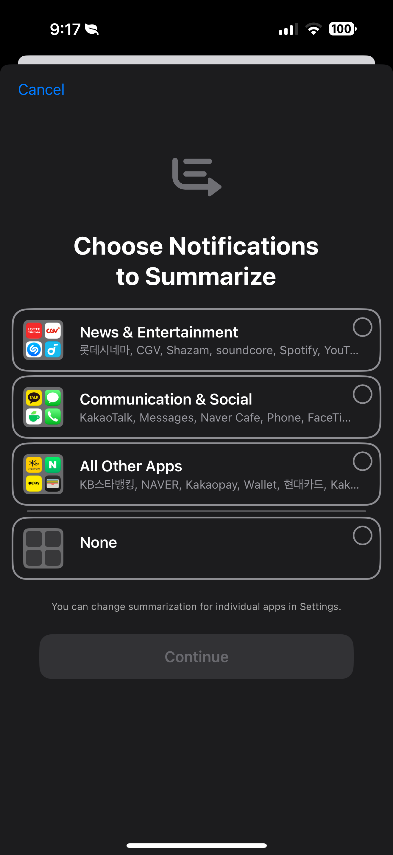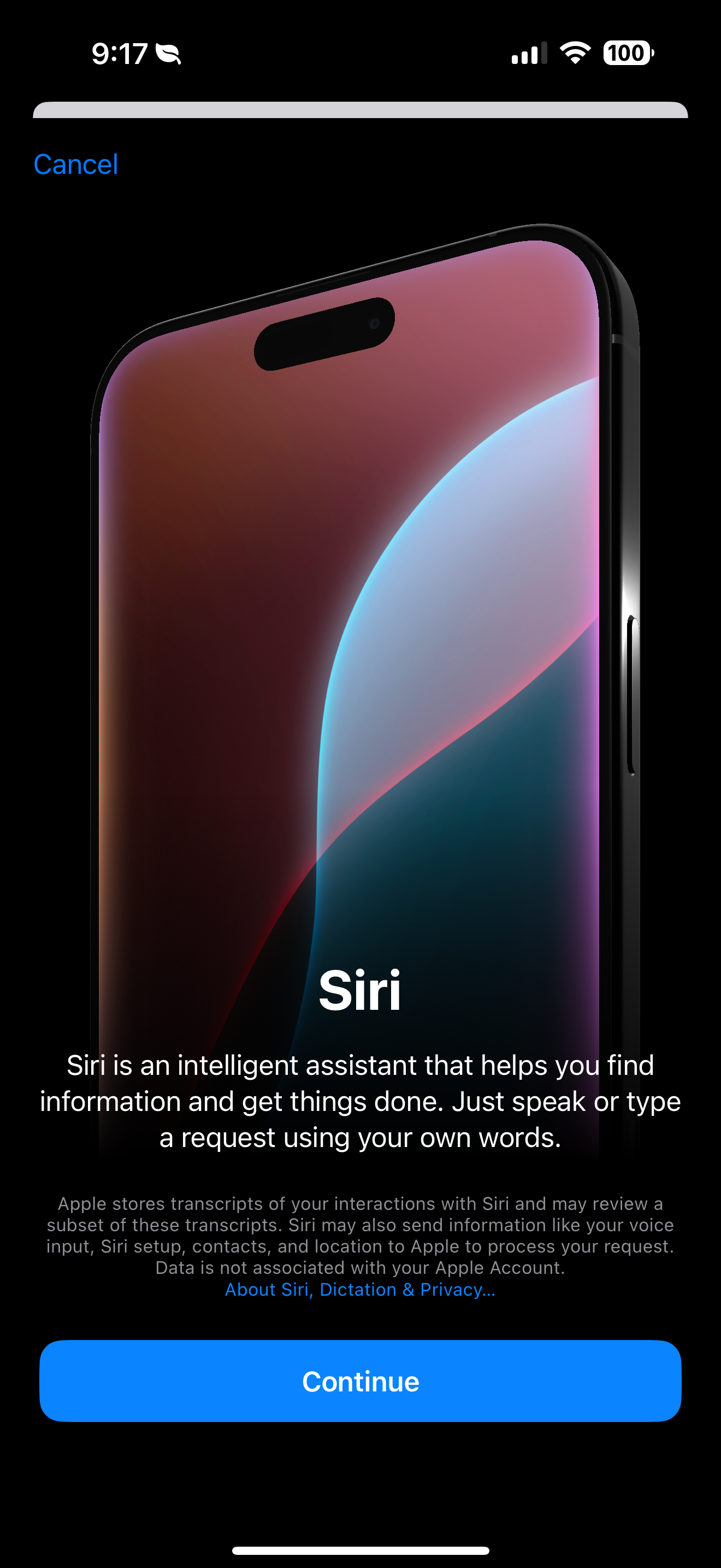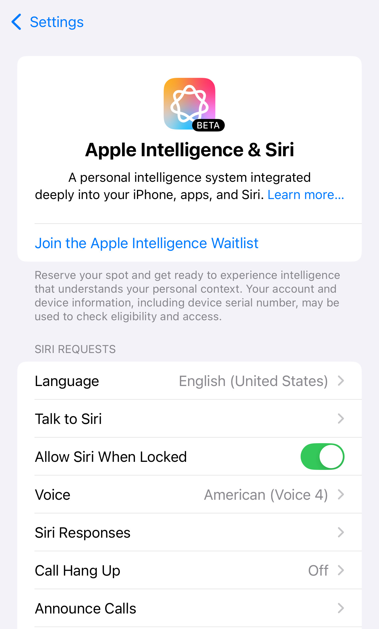 • 기능 설명: Apple이 도입한 AI 기능으로, 음성 및 텍스트 분석, 예측 등 다양한 스마트 기능을 제공합니다. 현재는 미국 영어로만 제공되며, 베타 버전입니다.