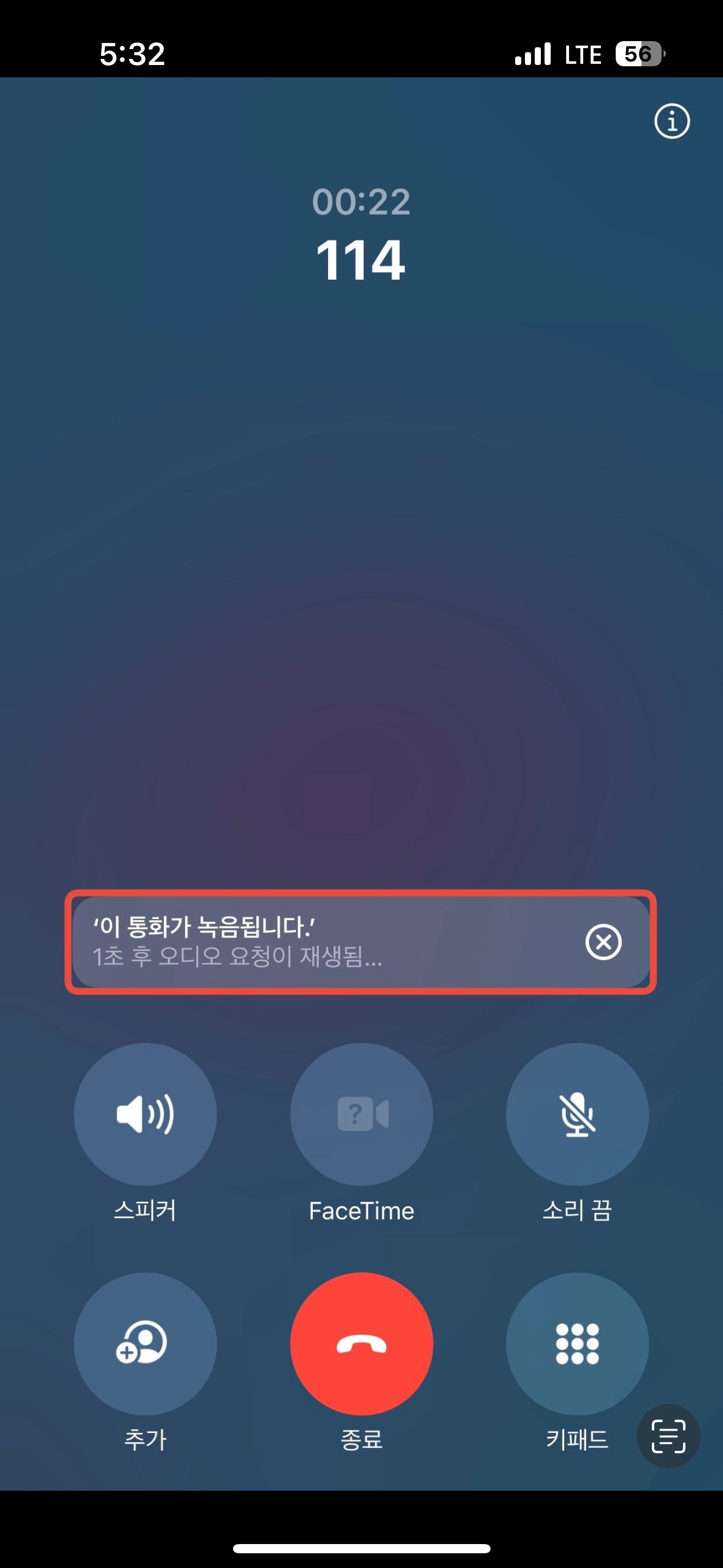 • 녹음이 시작되면 3초 후 오디오가 재생되고 “이 통화가 녹음됩니다.“라는 안내 멘트가 나오며 녹음이 시작됩니다.