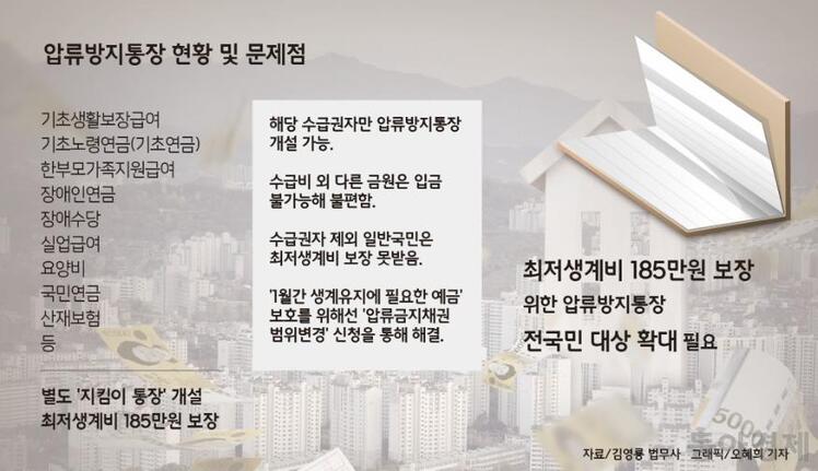 • 법적으로는 ‘최저생계비(185만 원)는 압류할 수 없다’고 규정되어 있지만, 실제로는 채권자가 채무자의 계좌를 통째로 압류해버리는 경우가 흔함.