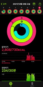 • 조작법: 워치 페이스에서 활동 앱을 실행해 현재의 링 상태를 확인하고, 목표 달성 여부를 체크할 수 있습니다.