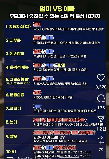 부모님으로부터 우리는 모습뿐 아니라 다양한 신체적 특징도 물려받습니다. 유전학 연구에 따르면, 어떤 특성은 엄마 쪽에서, 또 어떤 특성은 아빠 쪽에서 더 강하게 영향을 받기도 하지요. 이번 포스팅에서는 “엄마 vs 아빠” 관점에서 살펴본 10가지 주요 신체적 특성의 유전 메커니즘과 실제 연구 결과, 주의할 점까지 상세히 정리해보았습니다.