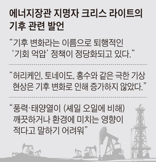 라이트는 풍력 및 태양광 발전이 깨끗하거나 환경에 미치는 영향이 적다고 주장하기 어렵다고 발언하며, 재생 가능 에너지가 화석연료만큼 경제적이지 않다는 점을 강조했습니다. 이는 화석연료 중심의 에너지 정책 회귀를 상징적으로 보여줍니다.