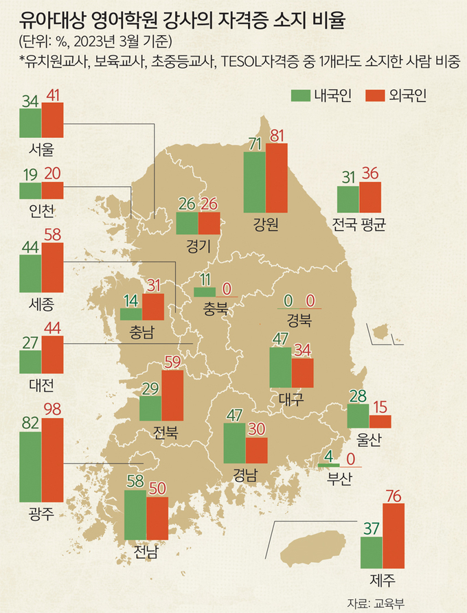 • 교사진 자격 및 구성: 교사 구성과 자격에서도 큰 차이가 있습니다. 영어유치원의 경우 원어민 강사 + 한국인 보조교사 형태가 많지만, 이들 강사는 유아교육 전문 자격이 없는 경우가 대부분입니다 . 법적으로 영어학원 강사는 유치원 정교사 자격증이 없어도 채용할 수 있어서, 영어만 가능하면 어린아이 지도 경험이나 발달 지식이 부족한 이들도 교사로 일할 수 있습니다 . 실제 2022년 기준 영어유치원 강사 중 **유치원·보육교사 자격증 또는 TESOL 등 관련 자격을 가진 비율이 내국인 31%, 원어민 36%**에 불과했다고 합니다 . 이에 비해 국제학교 유치원은 엄격한 교사 채용 기준을 두는 편입니다. 대부분 학사 이상 학력에 유아교육 또는 초등교육 교원자격을 가진 외국인 교사들이 담임을 맡고, 한국인 보조교사가 함께하는 형태가 일반적입니다. 교사 1인당 학생 수는 영어유치원도 대체로 1:10 안팎으로 적은 편이지만 , 국제학교는 경우에 따라 그보다 더 소규모 학급을 운영하기도 합니다. 원어민 환경 측면에서는 둘 다 영어만 쓰는 것은 비슷하지만, 교사의 전문성 면에서 국제학교 쪽이 체계적이고 안정적이라는 평가가 많습니다 .
