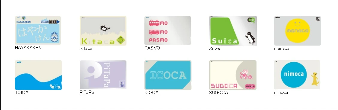 • 스이카는 JR동일본, 파스모는 수도권 사철 컨소시엄, 이코카는 JR서일본 발행.