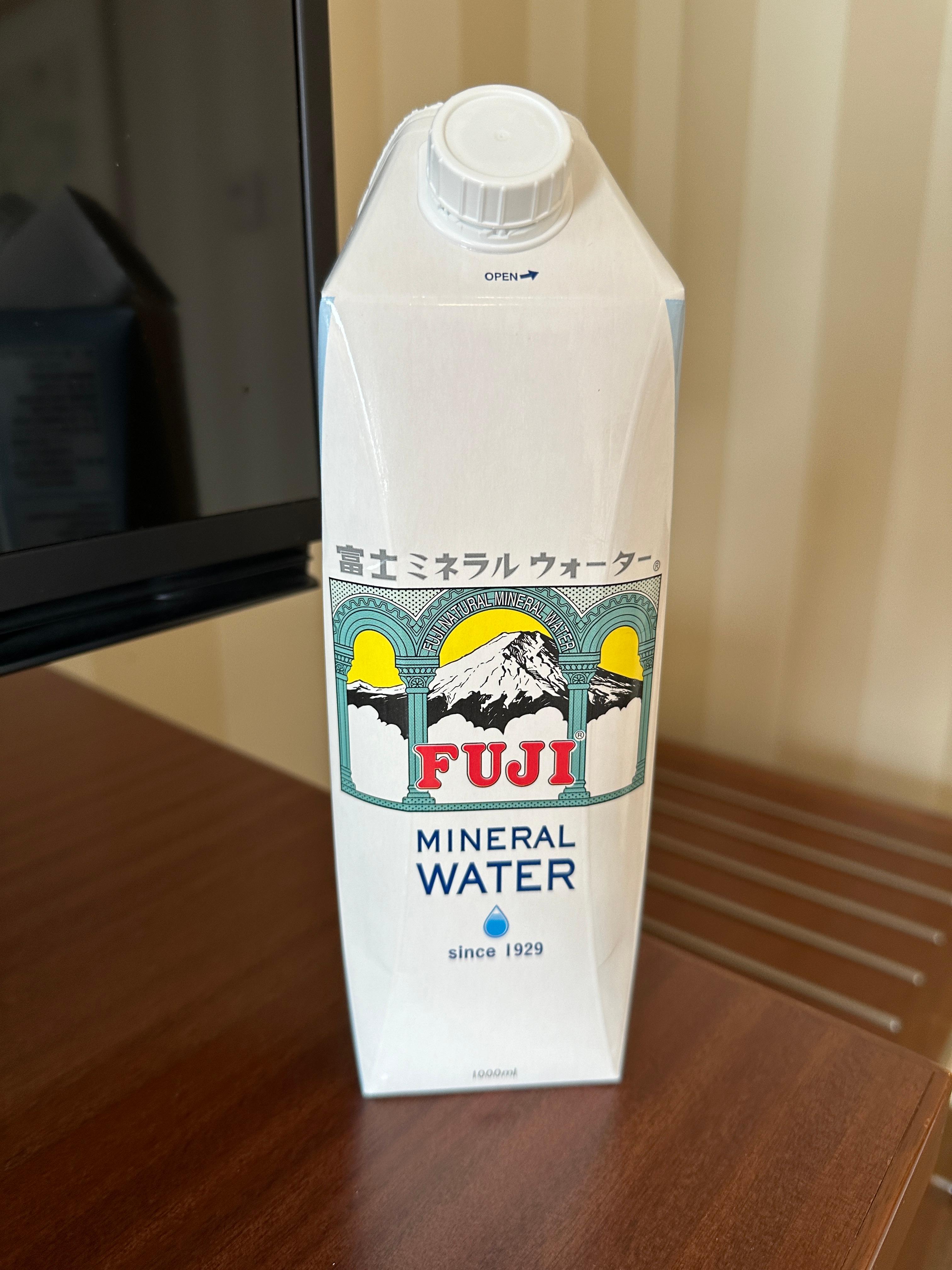 ‘Fuji Mineral Water’ 종이팩 생수가 마련되어 있어, 환경을 고려한 패키징이 돋보입니다. 필요 시 하우스키핑 또는 프런트에 요청하면 추가 제공도 가능합니다.