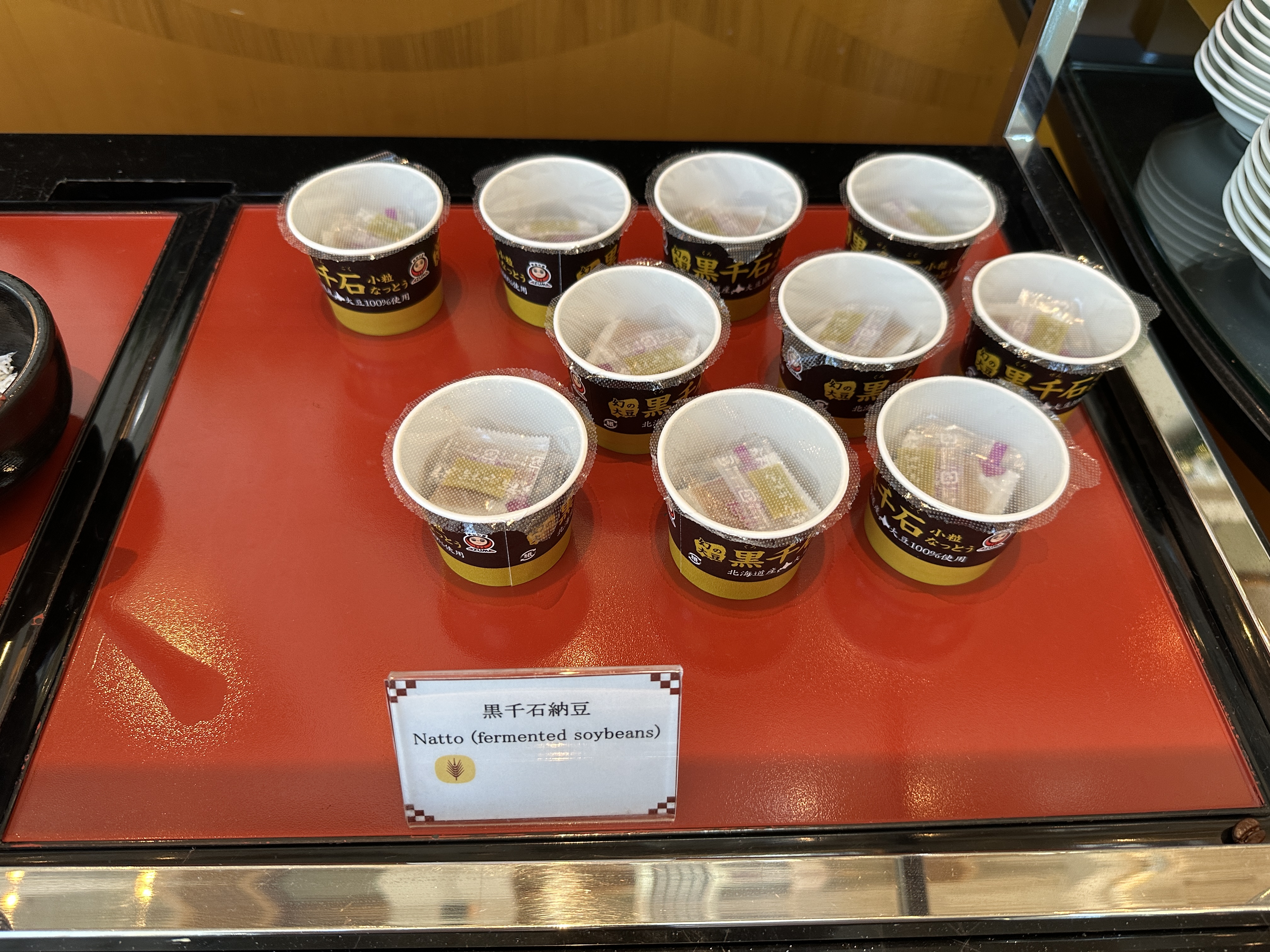 기본적으로 일본식 메뉴(밥, 미소시루, 낫토, 구운 생선, 절임 등)에 서양식 요소가 일부 섞인 하이브리드 뷔페 형태입니다.