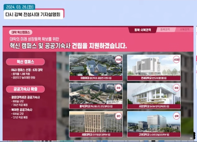강북권내 연세대, 서강대, 고려대, 이화여대, 홍익대, 세종대 총 6개 대학을 연구개발(R&D) 캠퍼스로 선정하고 용적률과 높이 제한을 완화도 병행합니다. 아울러 광운대 역세권(약 900실)과 북아현3구역(약 500실)에 다양한 커뮤니티를 공유하는 공공기숙사를 건립해 생활환경을 개선합니다. 지상철도 지하화로 '제2의 연트럴파크'를 조성하는 방안도 확대 추진한다고 합니다.