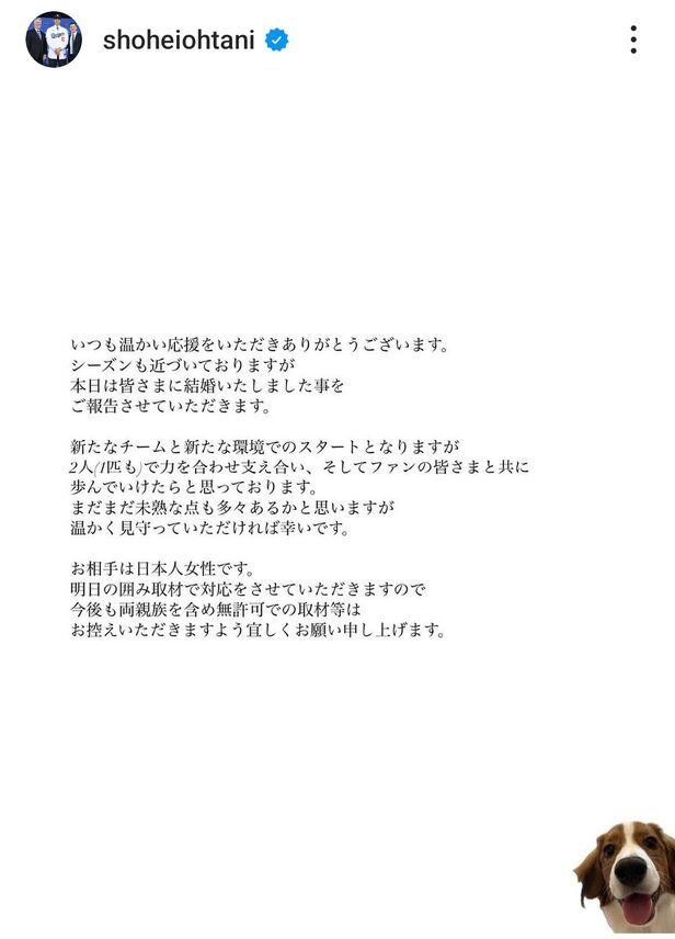 오타니 쇼헤이 선수는 2024년 2월 29일에 자신의 인스타그램을 통해 결혼 소식을 발표했습니다. 그는 "미국 내 모든 친구들과 팬들에게 발표를 할 것이 있다"면서 "다저스와의 경력의 새로운 장을 시작했을 뿐만 아니라 나에겐 매우 특별한 일본의 모국 사람과 새로운 삶을 시작했다"고 했습니다. 이어 "상대는 일본인 여성"이라며 "아직 미숙한 점도 많지만, 따뜻하게 지켜봐 주시면 감사하겠다"라고 덧붙였습니다. 상대방이 누구인지, 결혼 시점이 언제인지는 구체적으로 밝히지 않았습니다. 입장문 귀퉁이에는 반려견 '데코핀'의 사진도 첨부했습니다. 그녀의