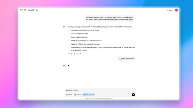 일반적인 ChatGPT나 GPT-4o는 즉각적인 답변이나 짧은 대화 중심으로 설계되었습니다. 질문을 입력하면 곧바로 대답을 해주는 식이죠. 반면, 딥 리서치는 훨씬 큰 규모의 웹 검색·분석 과정을 자체적으로 진행하면서, 사람 대신 꼼꼼하게 자료를 뒤지고, 종합한 뒤 보고서 형태로 결과를 전달합니다.