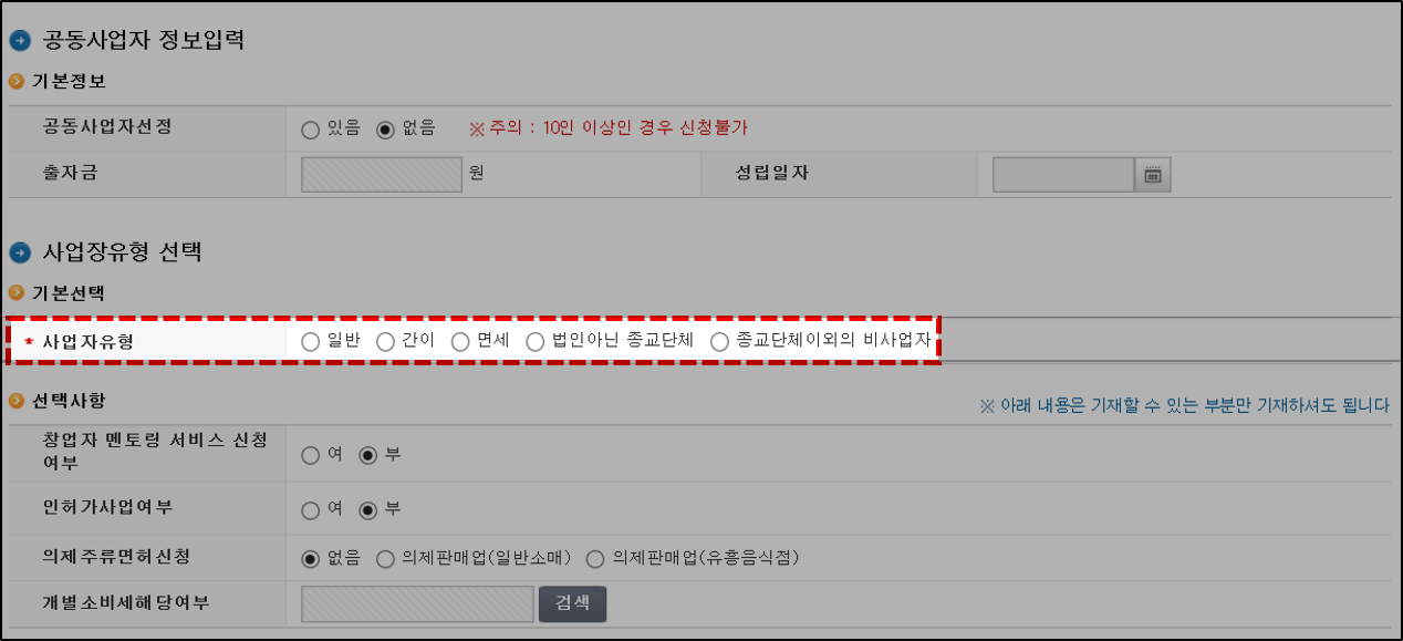 • 일반과세자, 간이과세자, 면세사업자 중 선택합니다.