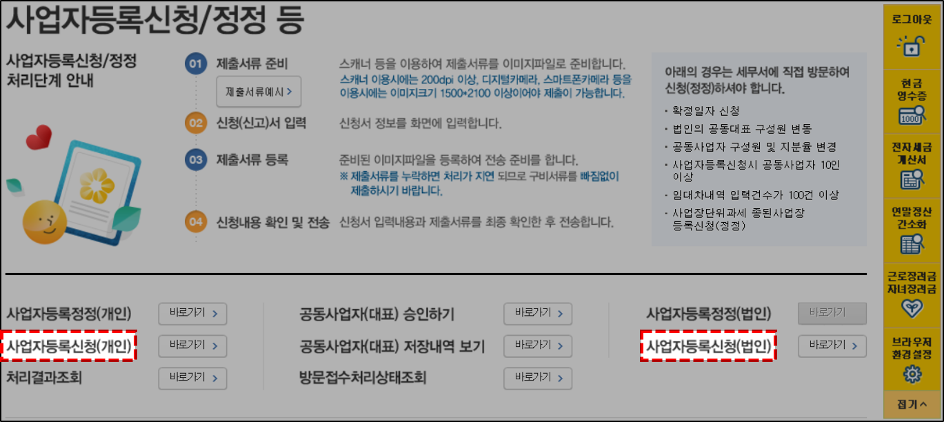 2. 하위 메뉴에서 [사업자등록 신청/정정 등]을 선택합니다.