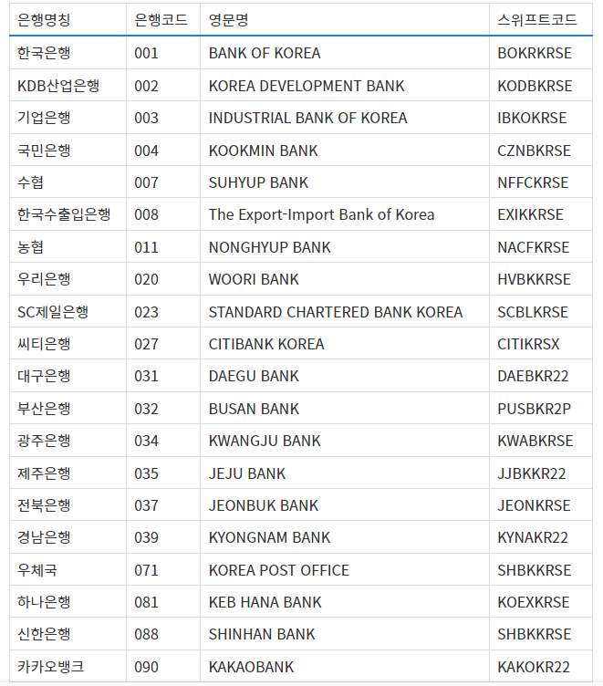 위 표에 소개된 대표 시중은행 코드를 참고하시되, 반드시 송금 전에 해당 은행 고객센터 또는 홈페이지를 통해 최신 정보를 재확인하세요.