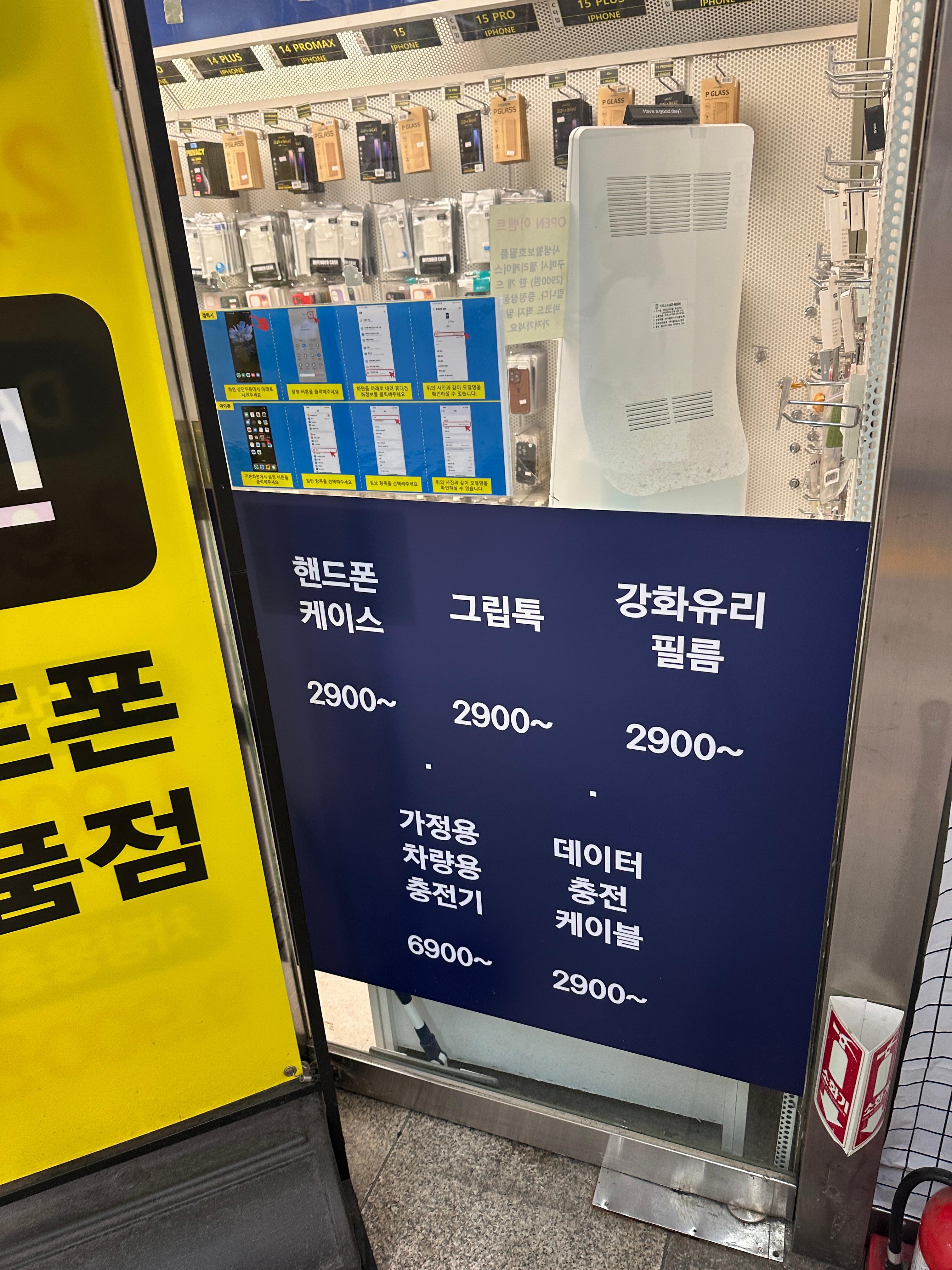 가격 측면에서 경쟁력이 돋보입니다. 기본 휴대폰 케이스는 2,900원부터 시작하고, 강화유리 액정보호 필름도 2,900원대로 매우 저렴하게 판매됩니다【28†】. 이는 주변 오프라인 매장의 일반적인 케이스 가격(보통 1만 원대 이상)과 비교할 때 상당히 합리적인 가격대입니다 . 예를 들어 인근 상가나 거리 노점에서 케이스를 구매하면 5,000원10,000원대가 흔하지만, 이 매장에서는 일부 품목을 23천 원대에 살 수 있어 가성비가 뛰어납니다. 충전기나 고속 케이블 등의 액세서리도 대형마트나 온라인 최저가 수준으로 책정되어 있어, 소비자 입장에서 가격 만족도가 높다는 평가를 받습니다. 전반적으로 온라인 쇼핑몰에 견줄 만큼 저렴한 가격에 현장에서 바로 제품을 확인하고 살 수 있다는 점이 큰 장점입니다.