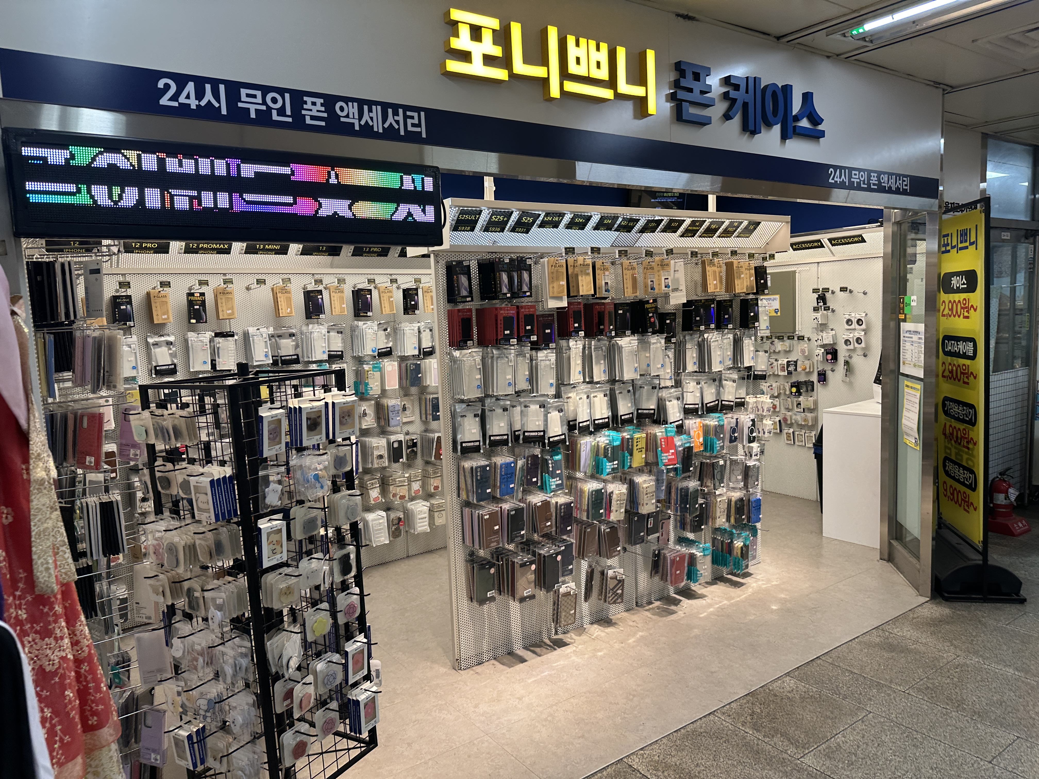 포니쁘니 폰 케이스 매장은 다양한 휴대폰 액세서리를 취급하는 24시간 무인 판매점입니다. 이름에서 알 수 있듯 주력 상품은 휴대폰 케이스이며, 아이폰을 비롯한 인기 기종의 케이스를 다수 보유하고 있습니다. 디자인 또한 캐릭터나 패턴 등 다채로운 스타일로 구성되어 있어 개성에 맞는 선택이 가능합니다. 이 외에도 강화유리 필름, 스마트톡(그립톡), 충전 케이블, 휴대폰 충전기 등 휴대폰 관련 다양한 용품을 한곳에서 구매할 수 있습니다 . 매장 내부 진열대를 보면 최신 기종별로 케이스와 액세서리가 잘 분류되어 있어 제품 구색이 풍부함을 확인할 수 있습니다.