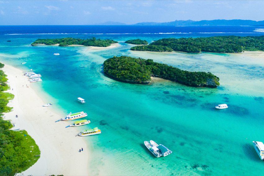 이시가키지마 가비라만의 아름다운 풍경 – 에메랄드 빛 바다와 푸른 하늘이 만든 절경 . 가비라만은 수영이 금지되어 있어 유리바닥배를 통해 바닷속 산호와 열대어를 관찰할 수 있다 .