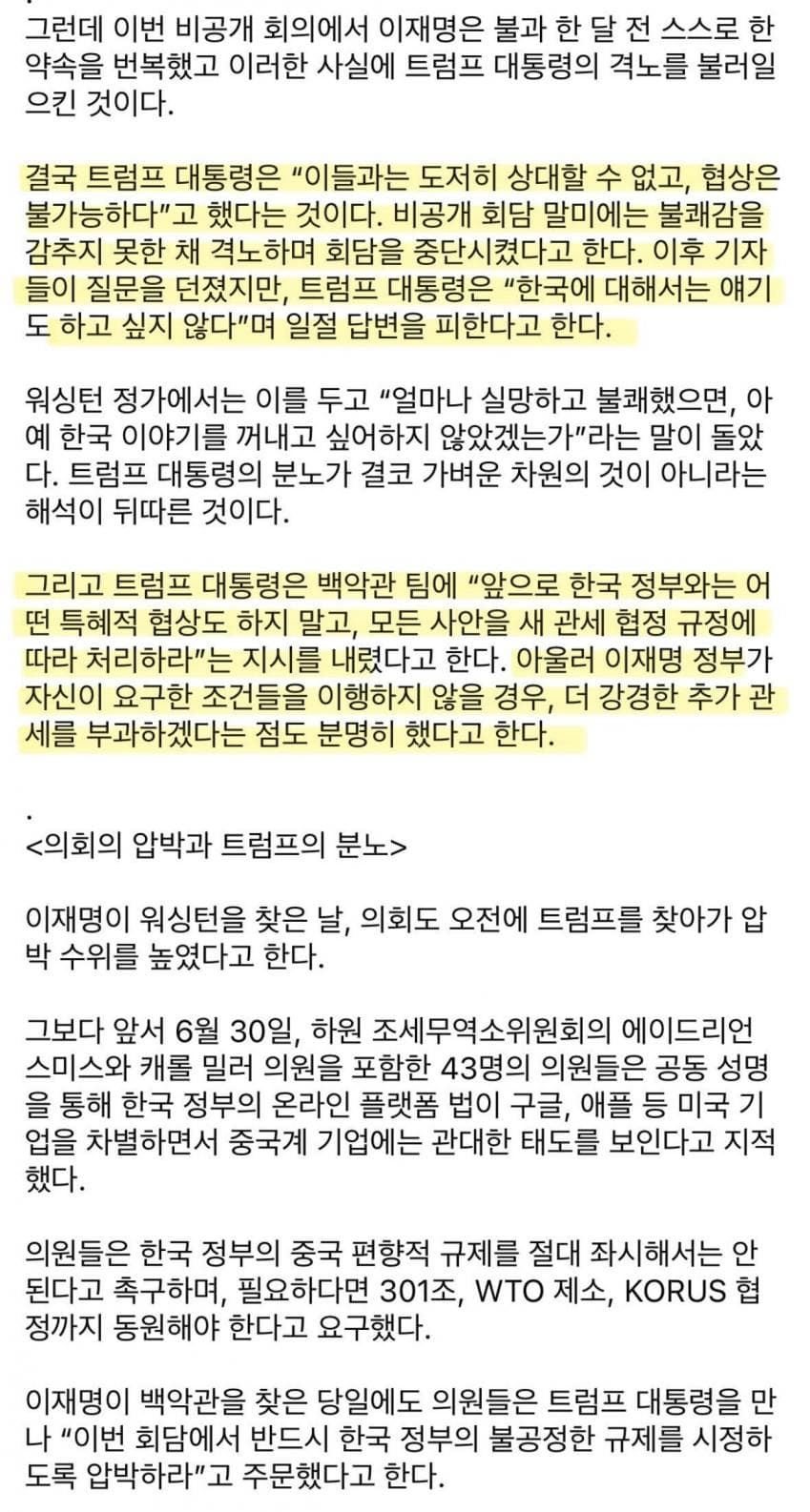 주장 ③: “트럼프 대통령이 회담 후 백악관 참모진에게 ‘앞으로 한국 정부와 특혜적 협상은 하지 말고 모든 사안을 새 관세협정 규정에 따라 처리하라’고 지시했고, 요구 조건을 이행하지 않으면 추가 관세를 부과하라고 했다.”