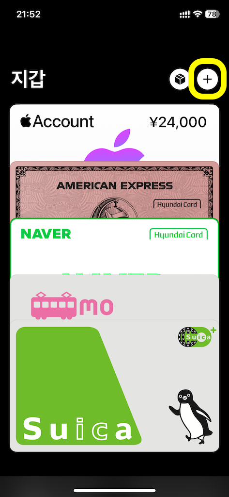 - Apple Wallet 앱을 열고 오른쪽 상단의 "+" 버튼 클릭.