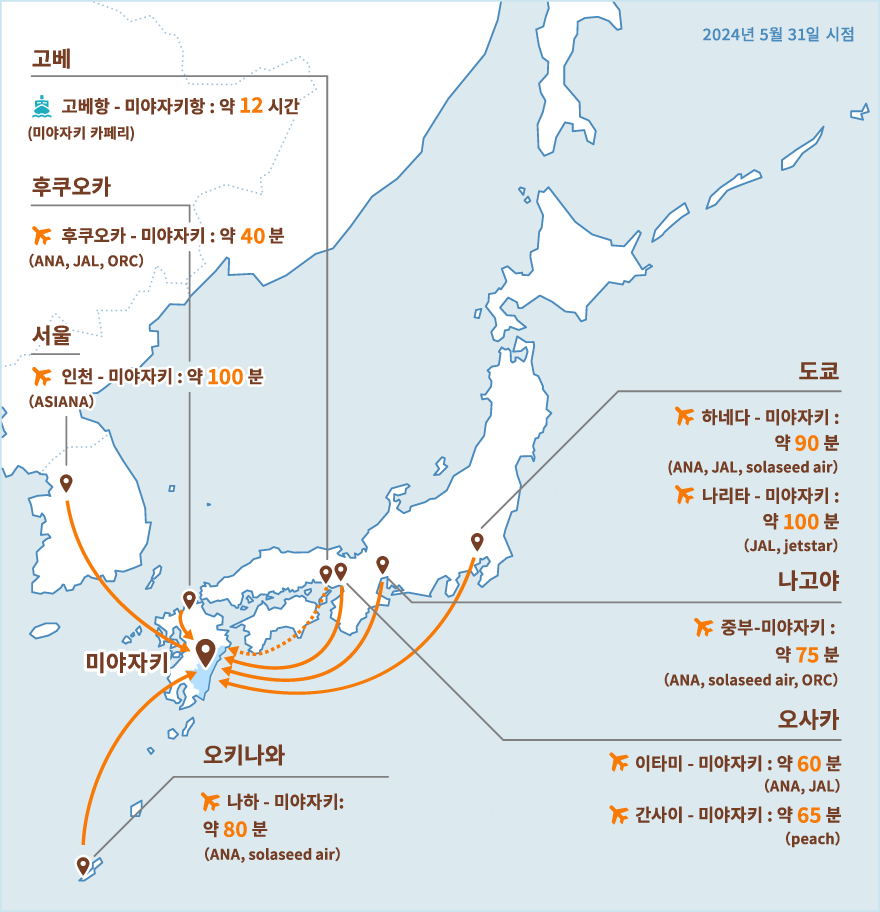 • 리무진 버스: 미야자키 시내 주요 호텔 및 관광지까지 정기 운행 (운행 시간 및 요금 확인 필요)
