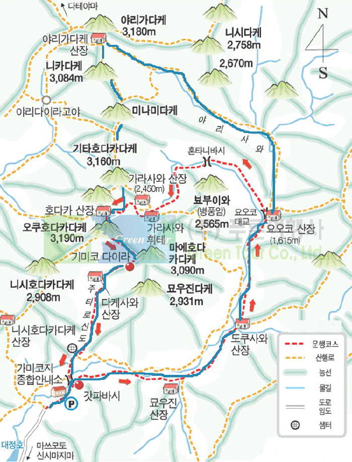 여러 봉우리로 이루어져 있으며, 등산객들에게 인기 있는 코스가 많습니다. 특히, 기타타카산은 등산 난이도가 높아 경험 많은 등산객들에게 도전적인 코스를 제공합니다.