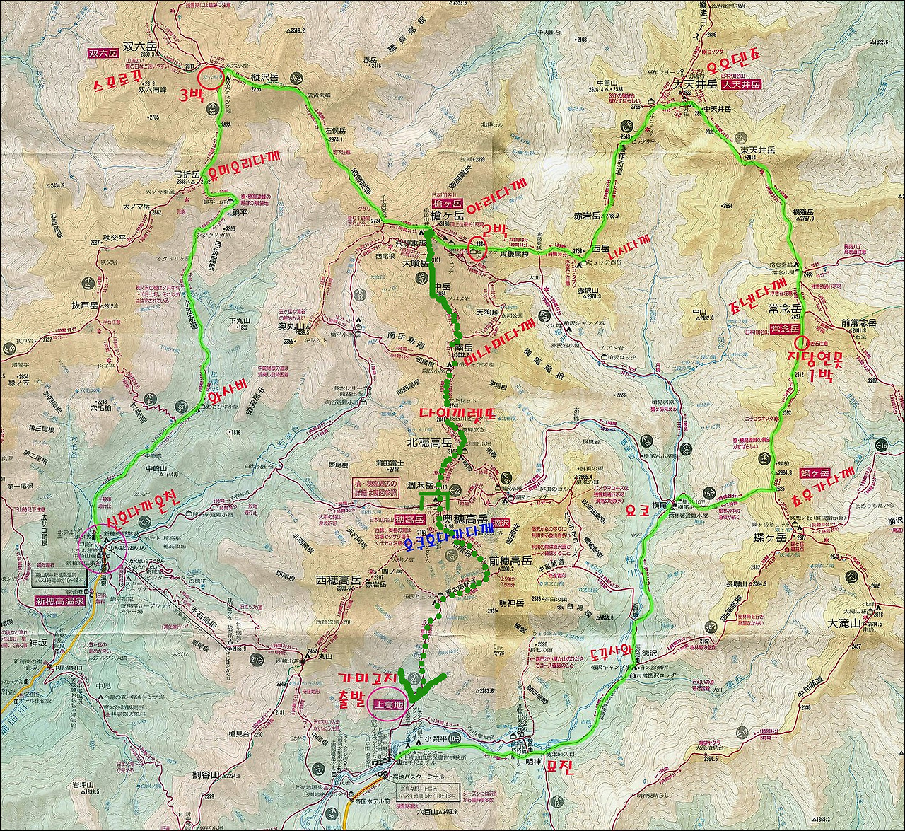 - 특징: 고도 차이가 크고, 날씨 변화가 심하여 체력이 필요합니다. 정상에서는 히다산맥의 장대한 경관을 감상할 수 있습니다. 코스는 여러 부분으로 나뉘어 있으며, 험준한 암벽과 깊은 계곡을 지나야 합니다. 등산객들은 철저한 준비와 경험이 필요하며, 안전을 위해 등산 가이드를 동반하는 것이 좋습니다.
