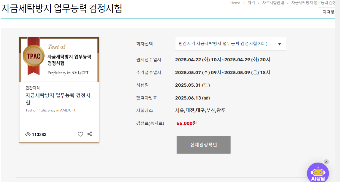 - 시험명: 자금세탁방지 업무능력 검정시험(TPAC)