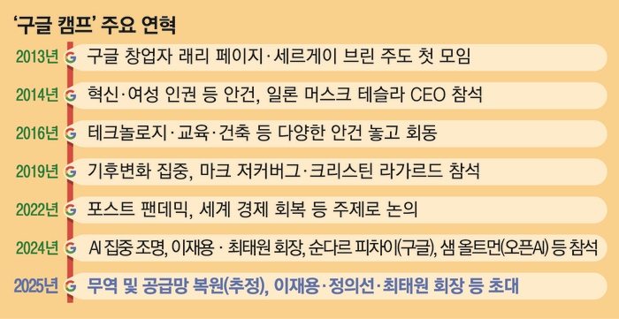 • 올해부터 한국 재계를 대표하는 이재용 삼성전자 회장, 정의선 현대차그룹 회장, 최태원 SK그룹 회장이 구글 캠프에 초청되어 참석함에 따라, 한국 기업들의 글로벌 공급망 관리, 기술 패권 경쟁, 그리고 무역 정책 관련 논의에 큰 관심이 집중되고 있습니다.