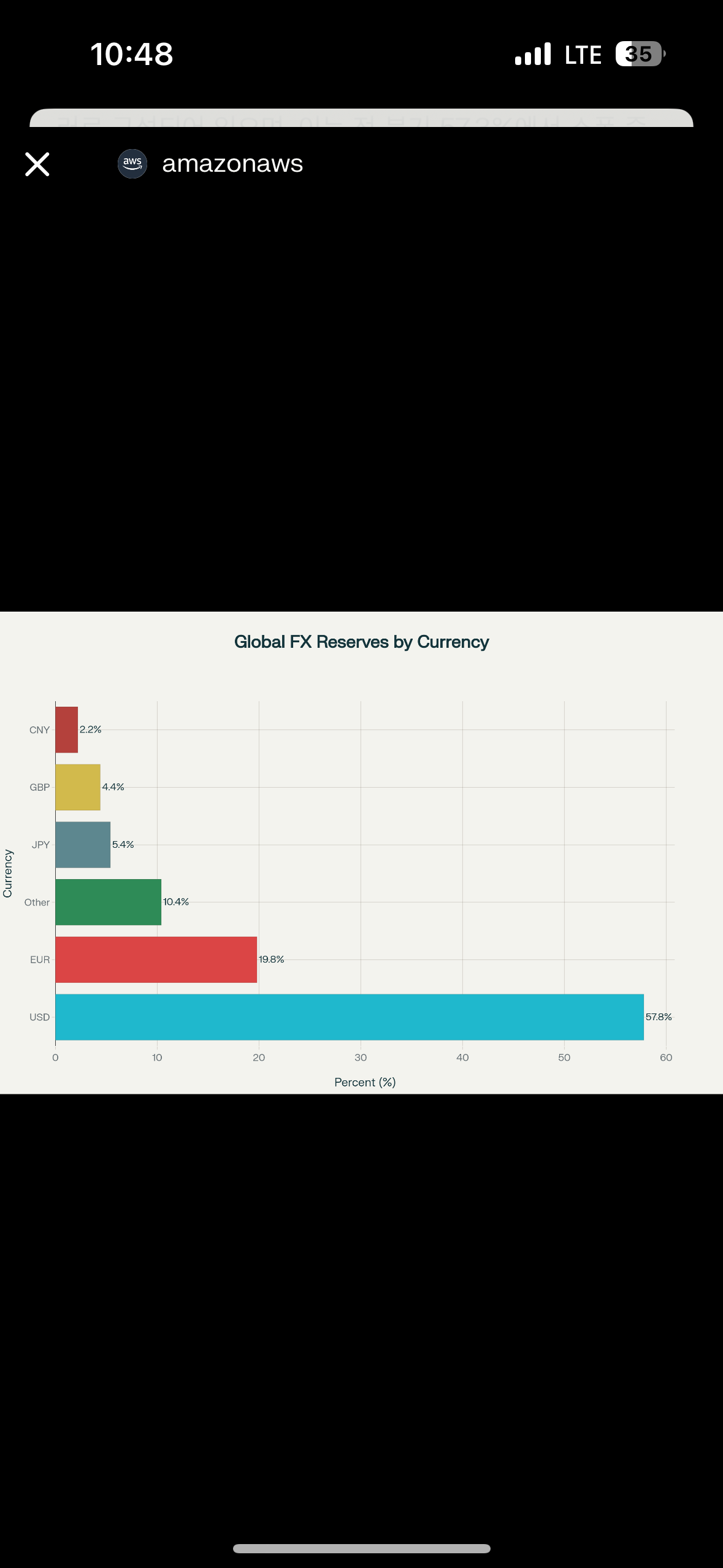 미국 달러는 여전히 글로벌 외환보유고에서 압도적인 지위를 유지하고 있다. 2024년 4분기 기준 전 세계 외환보유고의 57.8%가 미국 달러로 구성되어 있으며, 이는 전 분기 57.3%에서 소폭 증가한 수치이다. 유로화는 19.8%로 2위를 차지하고 있으며, 일본 엔화 5.4%, 영국 파운드 4.4%, 중국 위안화 2.2%가 뒤를 잇고 있다.