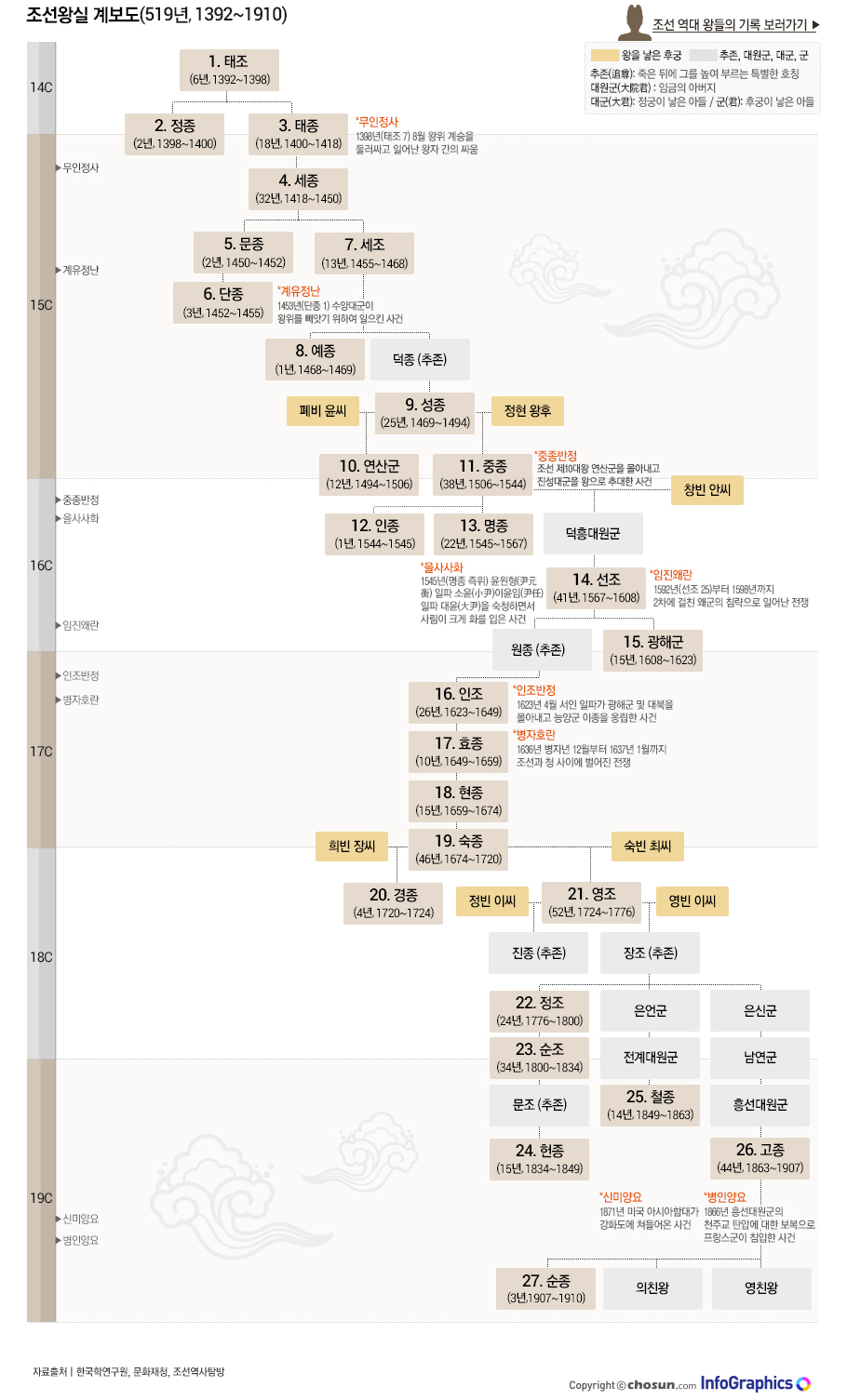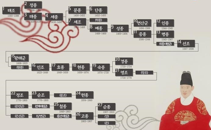 조선 27대 왕들의 묘호, 재위 기간, 업적, 당시 중국 연호를 더욱 상세히 정리했습니다. 각 왕의 정치·사회적 업적과 중국의 시대적 배경을 포함해 조선과 명·청의 관계를 이해할 수 있는 자료로 구성했습니다.