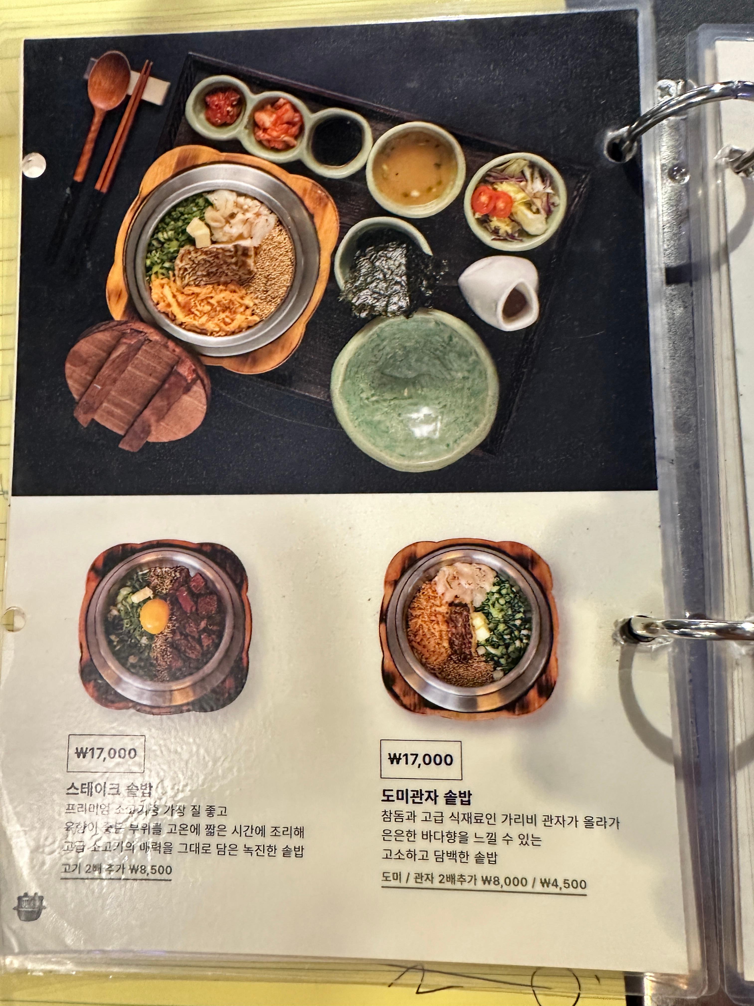 • 스테이크 솥밥 (17,000원): 두툼한 프리미엄 소고기를 숯향 살려 조리하여 진한 고기 풍미가 살아있는 고급 메뉴입니다.