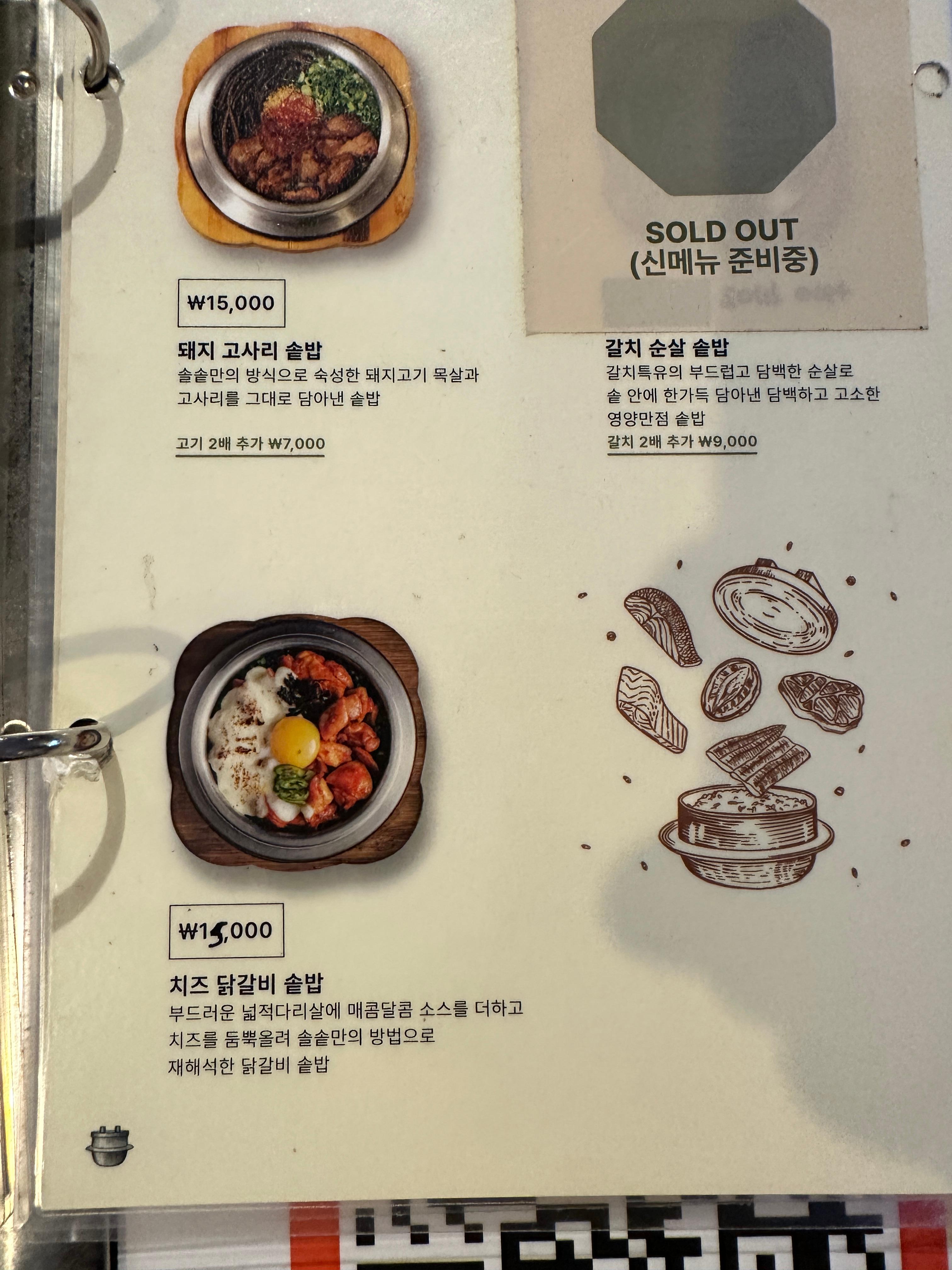 • 치즈 닭갈비 솥밥 (15,000원): 매콤달콤한 소스로 버무린 닭다리살 위에 치즈를 더한 메뉴로, 보다 젊은 취향에 잘 어울립니다.