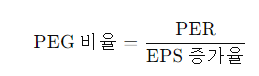 PEG 비율은 PER을 기업의 EPS 증가율로 나눈 값입니다. 이는 PER에 이익 성장률을 고려하여 기업의 가치를 평가하는 방법입니다.