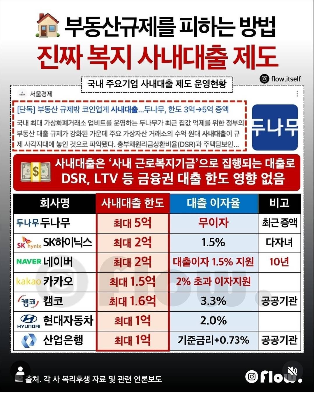 두나무(가상자산 업계) 최대 5억 원 (종전 3억→5억 인상)  무이자 (0%) 대출 원금 분할상환 (기간 내규 심사) 주택 구입 및 전세자금 용도 한정 .근속연수 등 내부 심사 기준으로 한도 결정 .
