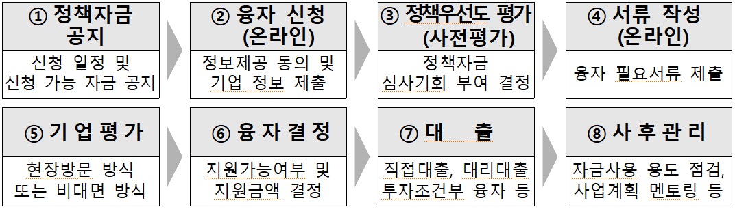 • 지원 방식: 장기 저리 정책자금 융자 (운전자금과 시설자금을 용도에 따라 구분하여 대출)