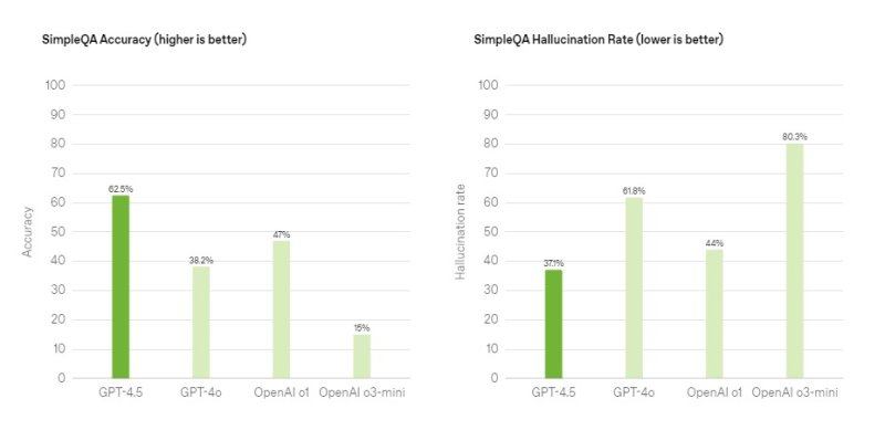 GPT‑4.5의 경우, 모델이 실제 사실과 동떨어진 정보를 생성하는 ‘환각’ 현상이 크게 줄어들었습니다.