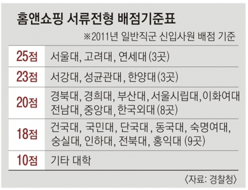 두 번째는 홈앤쇼핑에서 서류 전형 시 대학별로 부여하는 점수를 보여줍니다. 서울대, 고려대, 연세대 출신자는 25점을 받지만, 그 외 대학 출신자는 최대 10점 차이로 서류 전형에서 불이익을 받을 수 있습니다. 이는 명문 대학 출신자들에게 유리한 구조를 만들어내며, 취업 과정에서 불평등을 초래할 수 있습니다.