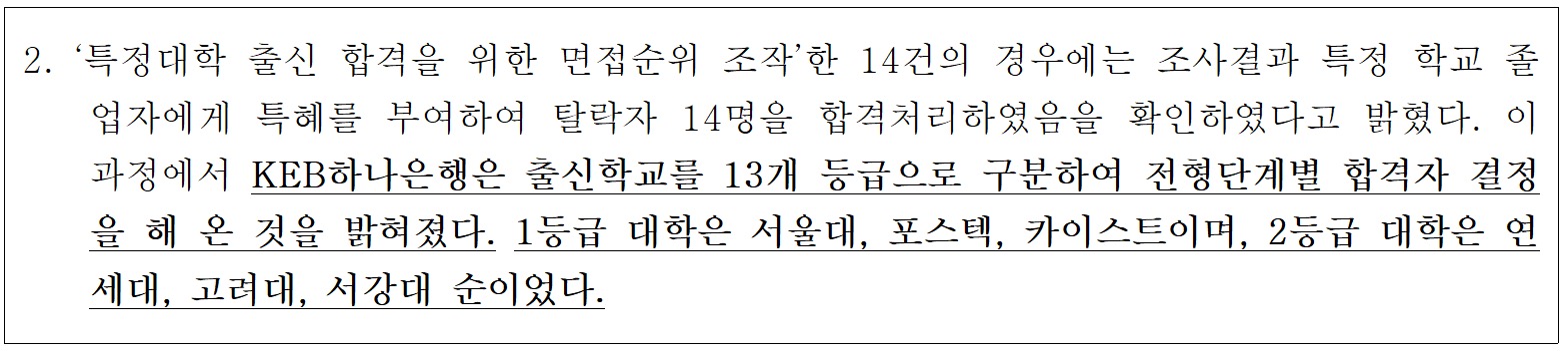 세 번째는 KEB하나은행이 출신 대학을 13개 등급으로 구분하여 전형 단계별 합격자를 결정한 사례를 보여줍니다. 1등급 대학에는 서울대, 포스텍, 카이스트가 포함되었으며, 2등급은 연세대 고려대 서강대, 3등급은 성균관대 한양대 이화여대 등입니다. 이들이 다른 등급의 대학 출신자들에 비해 더 높은 우선순위를 가지는 것을 확인할 수 있습니다. 이러한 등급화는 기업의 채용 절차에서 명문 대학 출신자들이 절대적으로 유리한 위치에 서게 하며, 이는 공정한 경쟁을 저해할 수 있습니다.