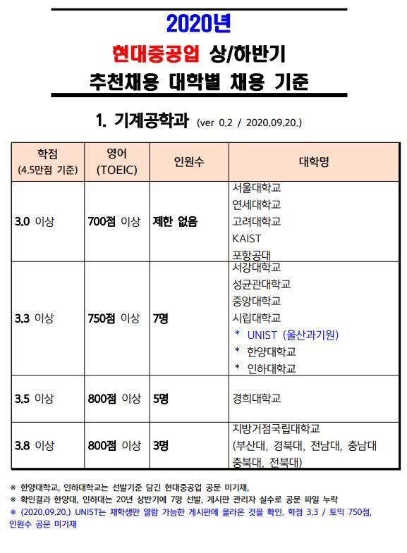 첫 번째 표는 현대중공업의 상반기 추천채용 대학별 채용 기준을 보여줍니다. 여기에서 확인할 수 있듯이, 대학별로 영어 점수 및 학점 기준이 다르게 설정되어 있으며, 특정 대학 출신자들에게는 지원 기회 자체가 제한될 수 있습니다. 예를 들어, 서울대, 연세대, 고려대, KAIST 등의 명문 대학 출신자는 3.0 이상의 학점과 700점 이상의 TOEIC 점수만으로도 지원이 가능하지만, 그 외의 대학 출신자는 더 높은 기준을 충족해야 합니다.