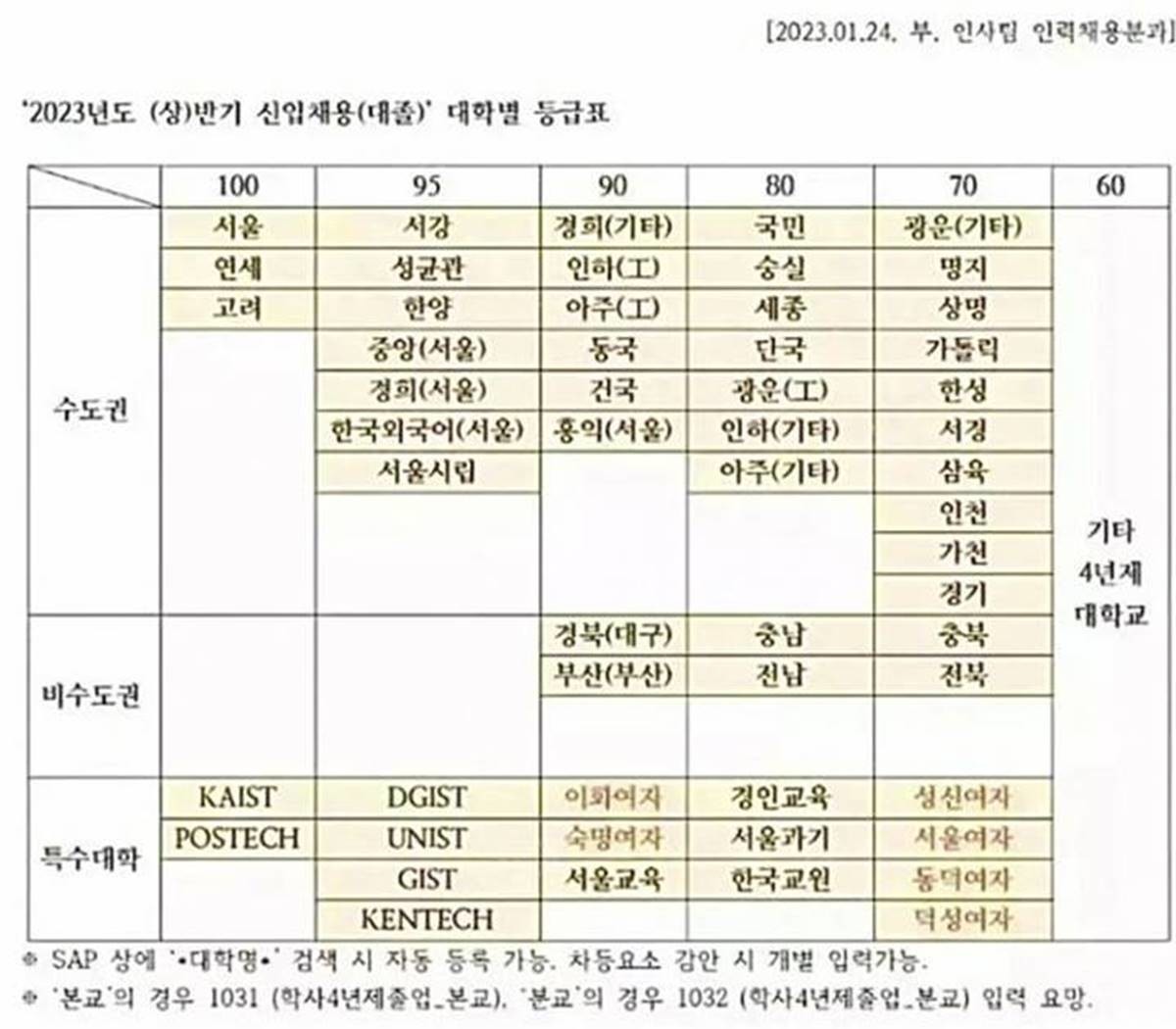위의 제조업 공기업 금융권 공통으로 취업에서 대학별 등급이 적용됨을 알 수 있습니다. 1등급은 어느 산업이든 서울대 카이스트 포항공대로 구성되며, 연고대가 포함되는 경우도 간혹 있습니다. 2등급은 연세대 고려대(단 은행 vc ib 외국계 등 금융권은 연고대와 서강대가 2등급)가 가장 많으며, 3등급 서강대 성대 한양대 4등급 중앙대 경희대 시립대 외대 등으로 구성됩니다. 사례들을 통해 확인할 수 있듯이, 학벌은 여전히 취업 시장에서 중요한 요소로 작용하고 있습니다. 그러나 이러한 학벌 중심의 채용 문화는 공정한 경쟁을 저해하며, 기업과 사회 전체에 부정적인 영향을 미칠 수 있습니다. 앞으로는 학벌보다는 실력과 능력을 바탕으로 한 채용 문화가 자리잡아야 하며, 이를 통해 보다 공정한 취업 시장이 조성될 필요가 있습니다.