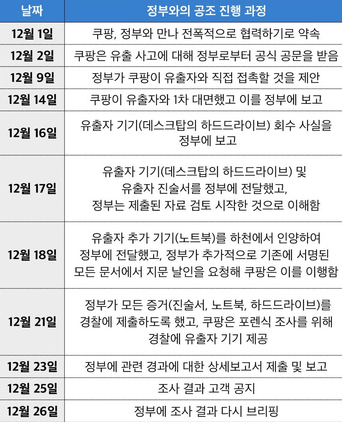 • 정부와의 협조 기록 공개 및 이미지 개선: 쿠팡은 한편으로 **“정부와 긴밀히 협력했다”**며 자체 조사가 독단적인 것이 아니었음을 강조하는 커뮤니케이션도 펼쳤습니다 . 보도자료에서 “관련 장치 등 자료를 확보되는 즉시 정부에 제출해왔다”고 설명하고, 실제로 12월 21일에 확보한 노트북을 경찰에 임의제출하는 등 수사에 협조했음을 내세웠습니다  . 심지어 쿠팡 측은 정부가 12월 초에 유출자와 접촉할 것을 제안하여 실행한 것이라는 주장까지 밝히며 (이에 대해 경찰은 “사전 협의는 없었다”라고 반박했으나), 최대한 정부와의 공조 아래 진행된 수사였다는 이미지를 만들려고 노력했습니다  . 이러한 협조 기록 공개 전략은 당국의 반발을 무마하고 기업 독선적 행동이라는 비판을 피하기 위한 PR로서 일정 부분 효과를 거두었습니다. 결과적으로 최종 발표 즈음에는 “쿠팡이 정부를 패스했다”는 부정적 프레임보다 **“쿠팡이 적극적으로 문제를 해결했다”**는 인식이 퍼지며, 쿠팡의 기업 이미지를 방어하는 데 성공했습니다. 위기관리에 있어 이해관계자(정부 당국)와의 갈등을 최소화하려는 이러한 대외 커뮤니케이션 조율 능력 역시 쿠팡이 보여준 전략적 대응으로 평가할 수 있습니다.