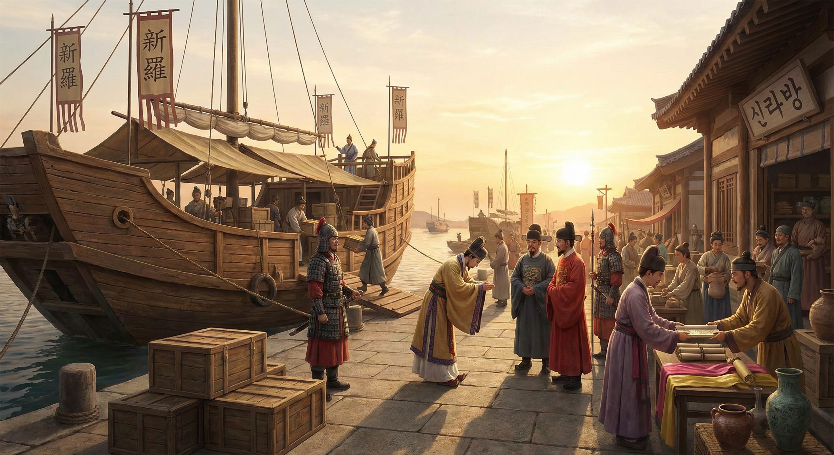 • 빈번한 사신 왕래와 무역: 신라는 8~9세기 동안 수십 차례 사신을 파견하고 당으로부터도 많은 사신을 받았다 . 해로(海路)를 통한 왕래가 활발하여, 산둥 반도-황해-남해를 잇는 항로로 사절과 상인이 오갔다. 신라 사신은 때로 왕족이나 고위 관리가 겸했고, 이들은 당에서 관작을 제수받는 등 예우를 받았다. 상인들은 신라방, 신라소 등 당 국내 거주지에서 활동하며 신라향(新羅香), 신라布 같은 상품을 교역했다. 장보고의 해상활동 이후 해적 위협이 줄어들고 노예무역이 금지되면서 교역 환경도 개선되었다 .