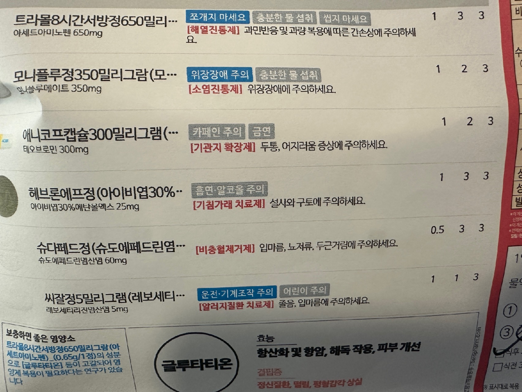 다른 약과의 상호작용: 정확한 상호작용 정보 제공이 어렵습니다. 일반적인 감기약의 상호작용을 고려하면, 중추신경 억제제(수면제, 진정제, 알코올 등)와 함께 복용 시 일부 성분에 의해 과도한 진정 또는 반대로 자극 증강이 나타날 수 있습니다. MAO억제제 계열 항우울제를 복용 중인 환자는 일부 감기약 성분(예: 슈도에페드린, 덱스트로메토르판 등)과 병용 시 혈압 상승이나 중추 흥분 부작용이 나타날 수 있으므로 피해야 합니다. 또한 처방받은 약 이외에 시중 종합감기약을 추가 복용하지 않도록 주의해야 하는데, 이는 과다복용을 막고 중복 성분으로 인한 부작용을 예방하기 위함입니다.