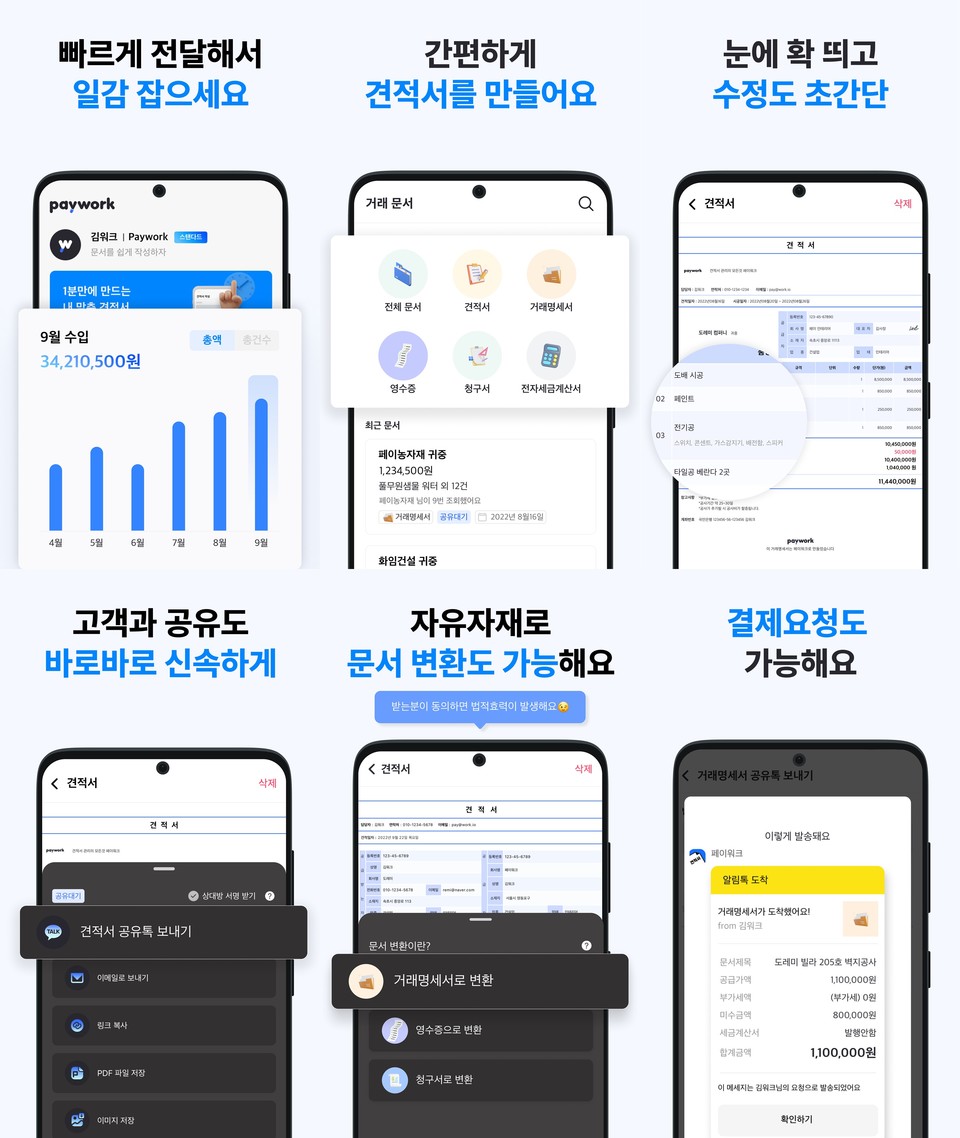 페이워크는 거래 문서 작성부터 대금 청구, 정산까지의 전 과정을 디지털화하여 사용자 편의를 극대화했습니다.